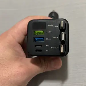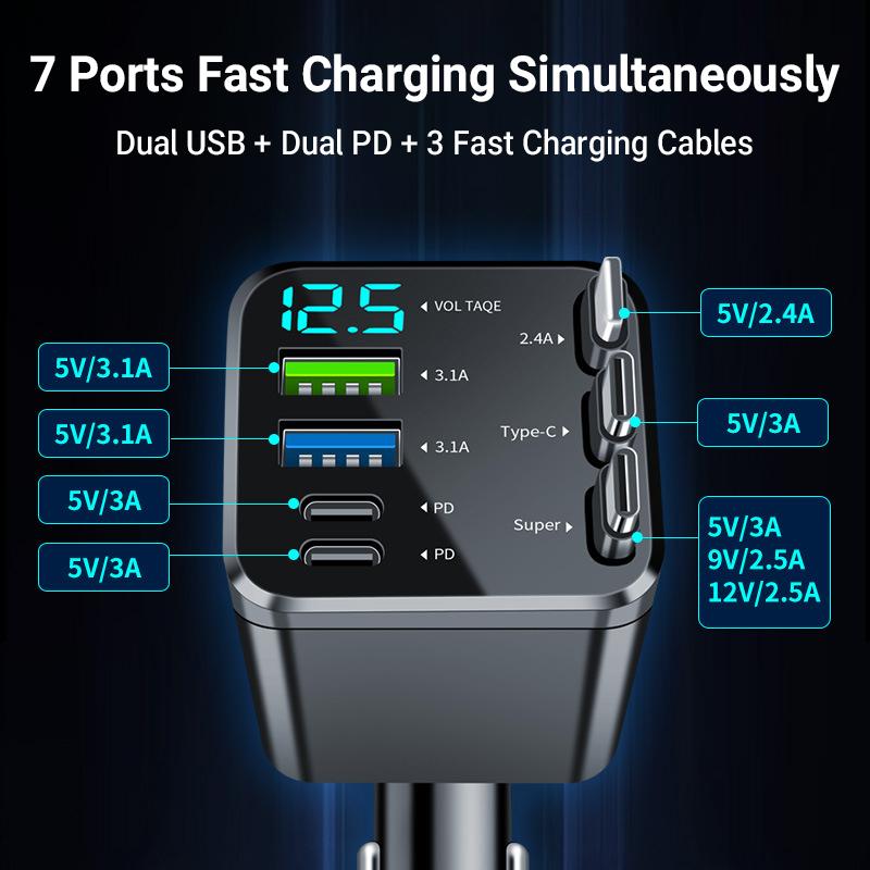 No more messy cables cluttering up your console area! Convenient retractable cables for 3 different ports. Digit guage shows power output. Fast charging.