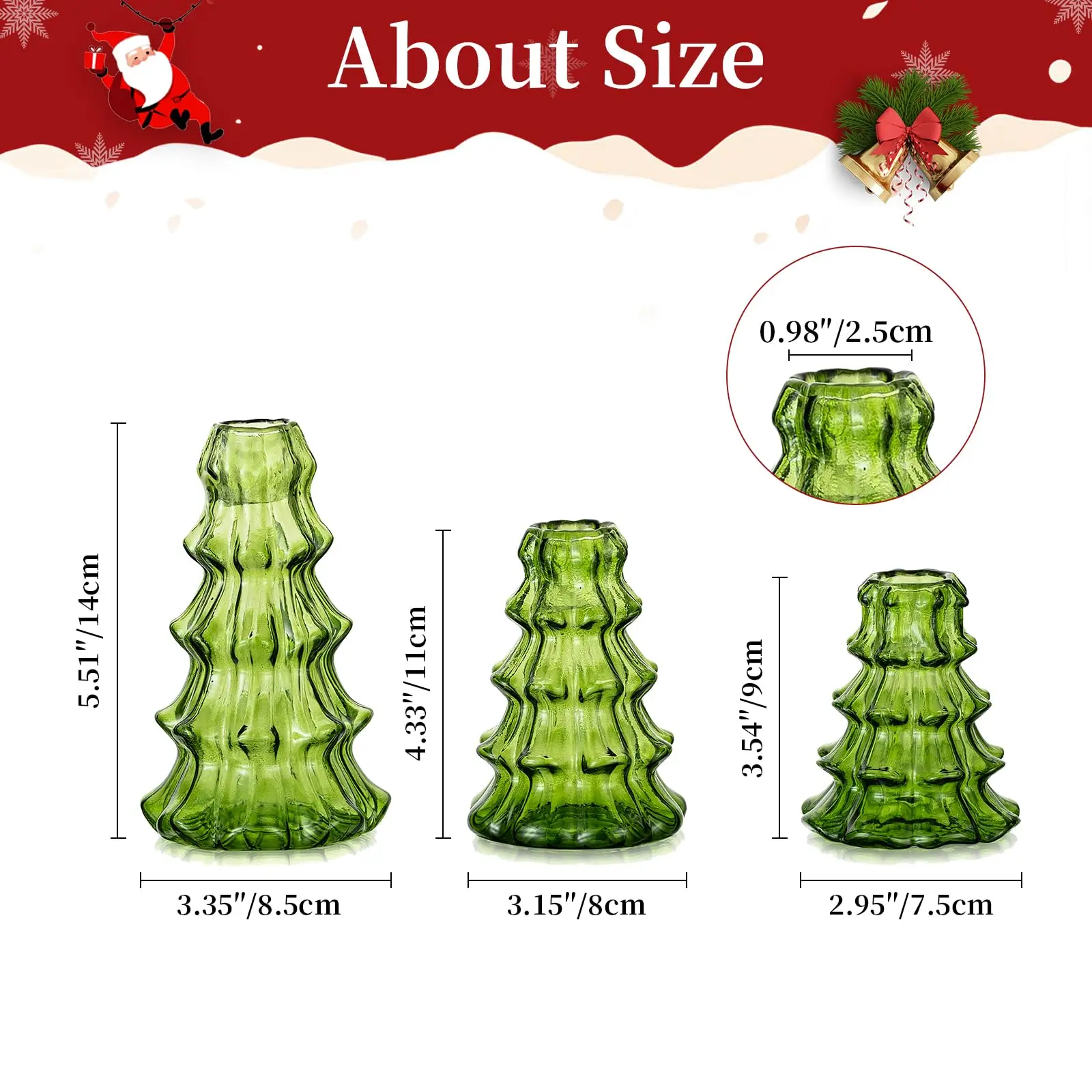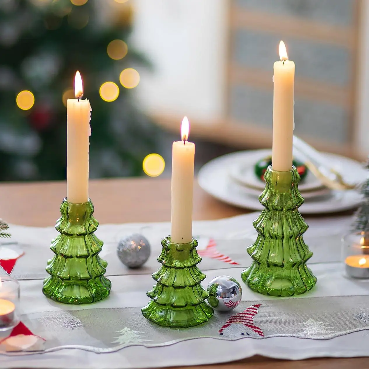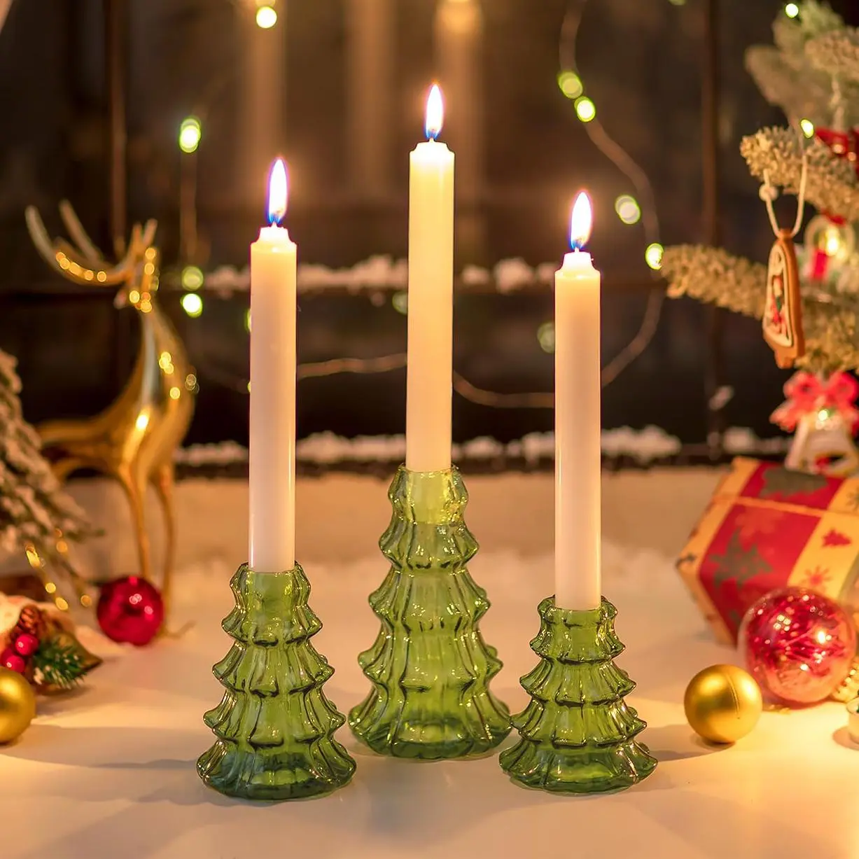• Christmas Table Decorations: The holders set offers various heights for staggered tabletop settings, adding an elegant presence to your Christmas display. Green candle holders serve as pretty table centerpieces for dinner parties, dining rooms, and also work well as holiday decorations for fireplaces, windowsills.