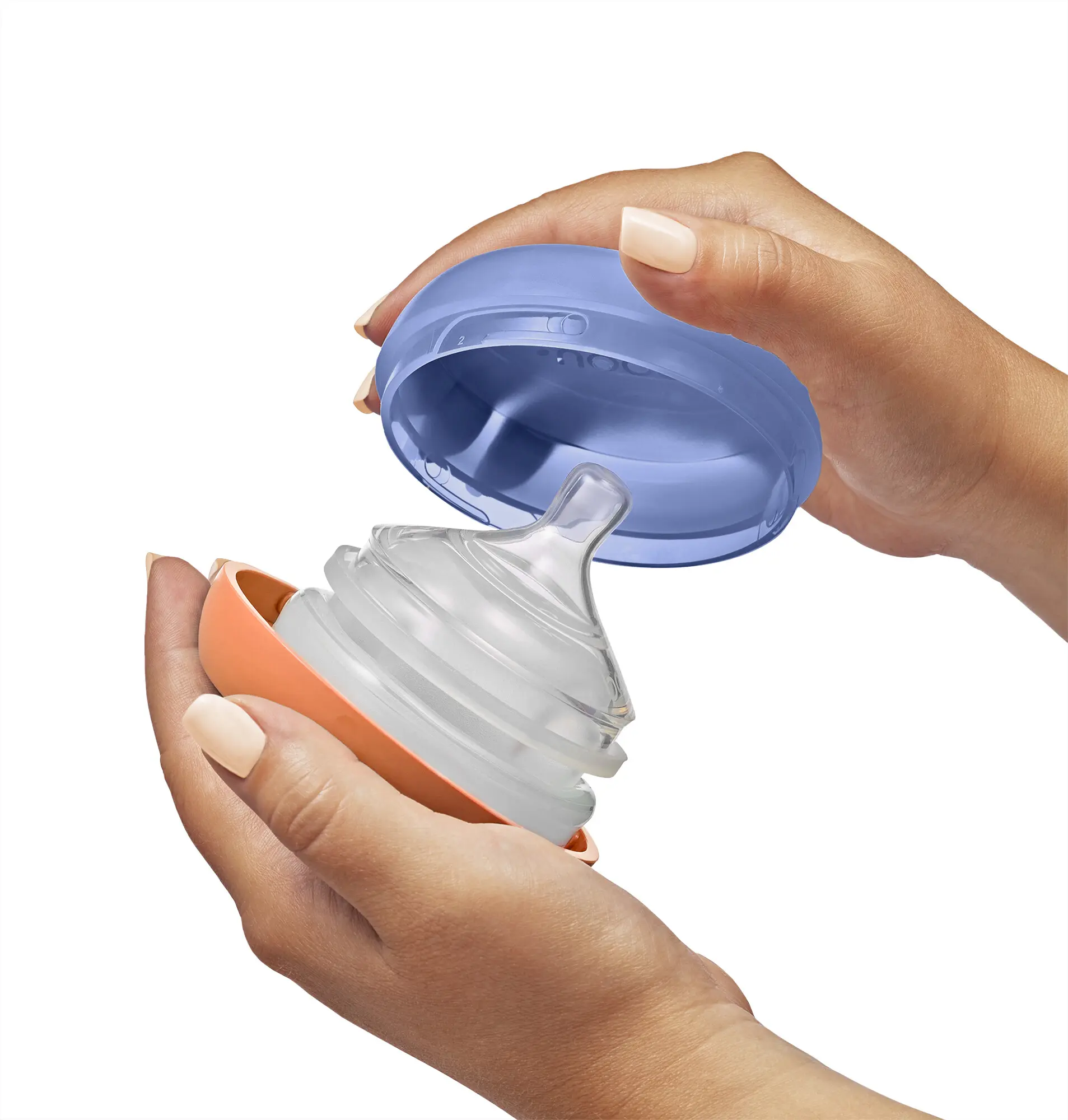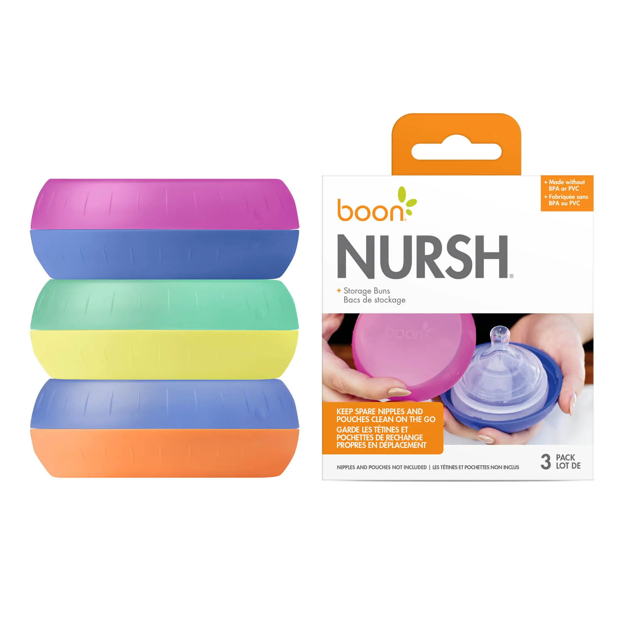 Life on the go with baby just got easier. The NURSH Storage Bun helps you to keep your NURSH pouch and nipple fresh and ready to use. Take along one NURSH Bottle with two stocked Storage Buns and you’ll have three clean bottles that take up way less space. It’s a great way to keep pacifiers clean too! Best yet, no more frantic searching through the diaper bag for a fresh bottle nipple or pacifier only to discover it covered in cracker crumbs....or worse.
