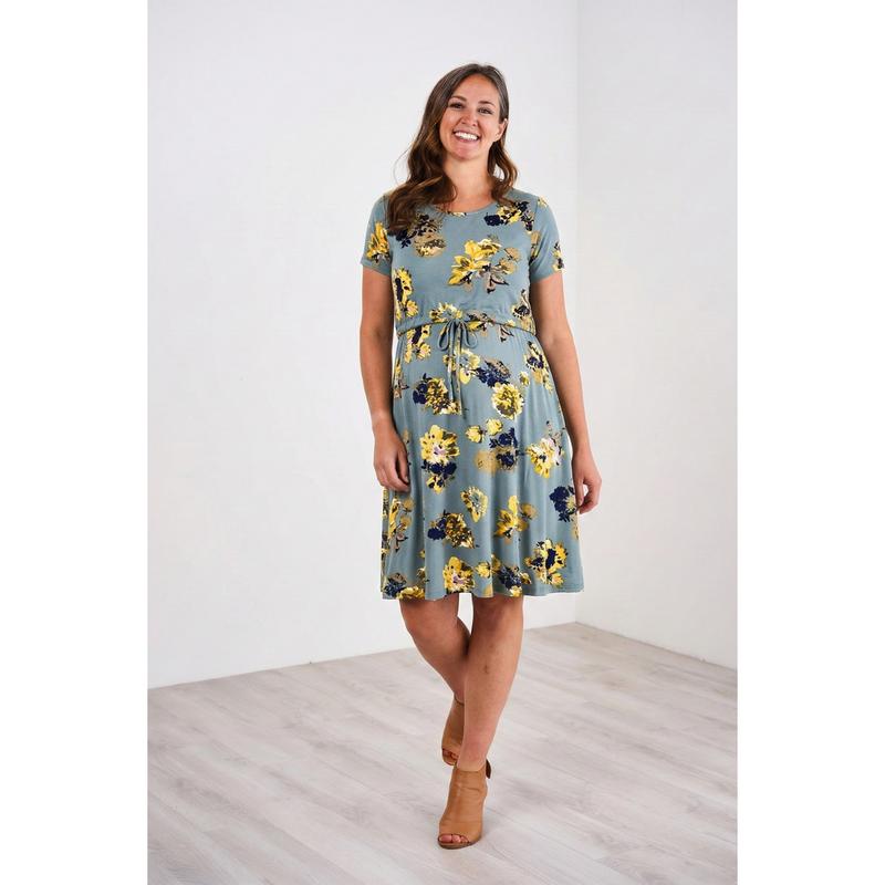 The drawstring dresses are probably my favorite LM dress to wear because the nursing access is so easy and you can adjust the tightness a little bit by how you tie. I also prefer the length of them over most their other dresses. The drawstring dresses hit around my knee, sometimes a bit below, and I'm 5'6" and long legged. Other dresses from them are most often mid-calf. The nursing access on most of them, I'll admit, is a bit wonky and doesn't quite line up with my bust. However, with the access flap down you can't tell a bit. I do wish the drawstring was elasticized so that it was easier to lift up the nursing access without untying. I can do it on my older drawstring dresses that are cotton blend but not the newer ones that are different material. Note that the drawstring detail is only on the front, so from the back it just looks like a t-shirt dress.