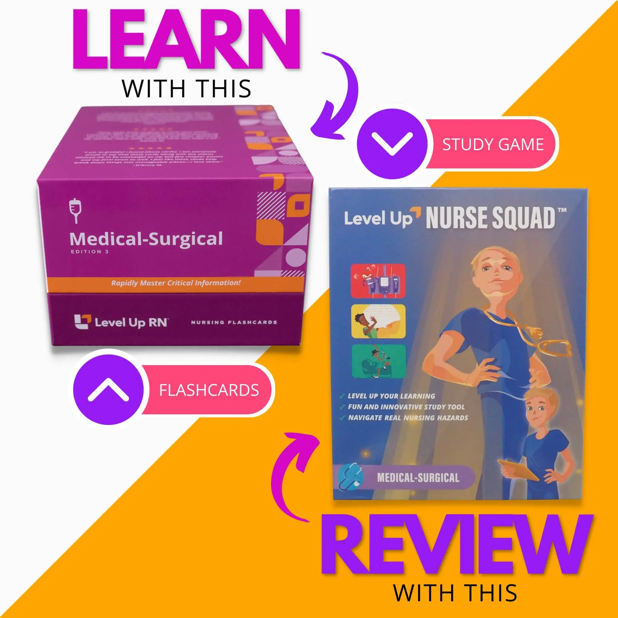 Ever feel like med-surg nursing content is a never-ending mountain? Time to turn that mountain into a molehill with the Ultimate Med-Surg Bundle. This dynamic duo pairs proven flashcards—packed with the must-know medical-surgical nursing facts minus the fluff—with Level Up Nurse Squad, a nursing card game that turns study time into game time.