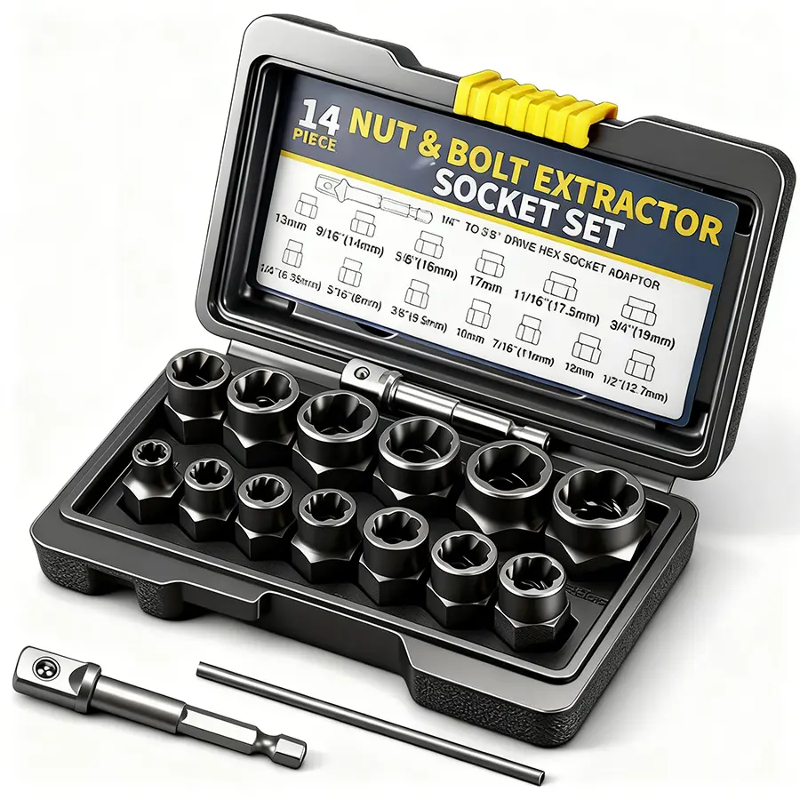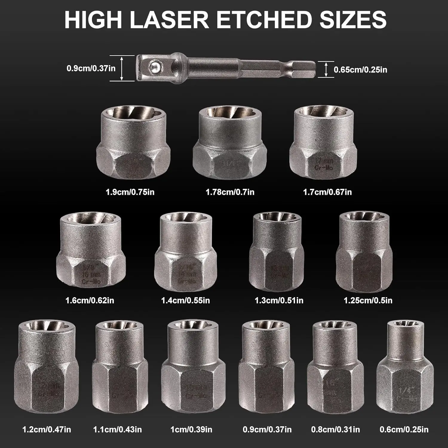 ·Premium & Resistant: bolt extractors are made of high-hardness chrome-molybdenum steel with a sandblasted finish for superior durability and longer life. Full sizes include SAE (inches) and metric (mm): 1/4", 5/16"(8 mm), 3/8", 10 mm, 7/16"(11 mm), 12 mm, 1/2", 13 mm, 9/16"(14 mm), 5/8"(16 mm), 17 mm, 11/16", 3/4"(19 mm). Which you can do the work with more flexibility and ease
