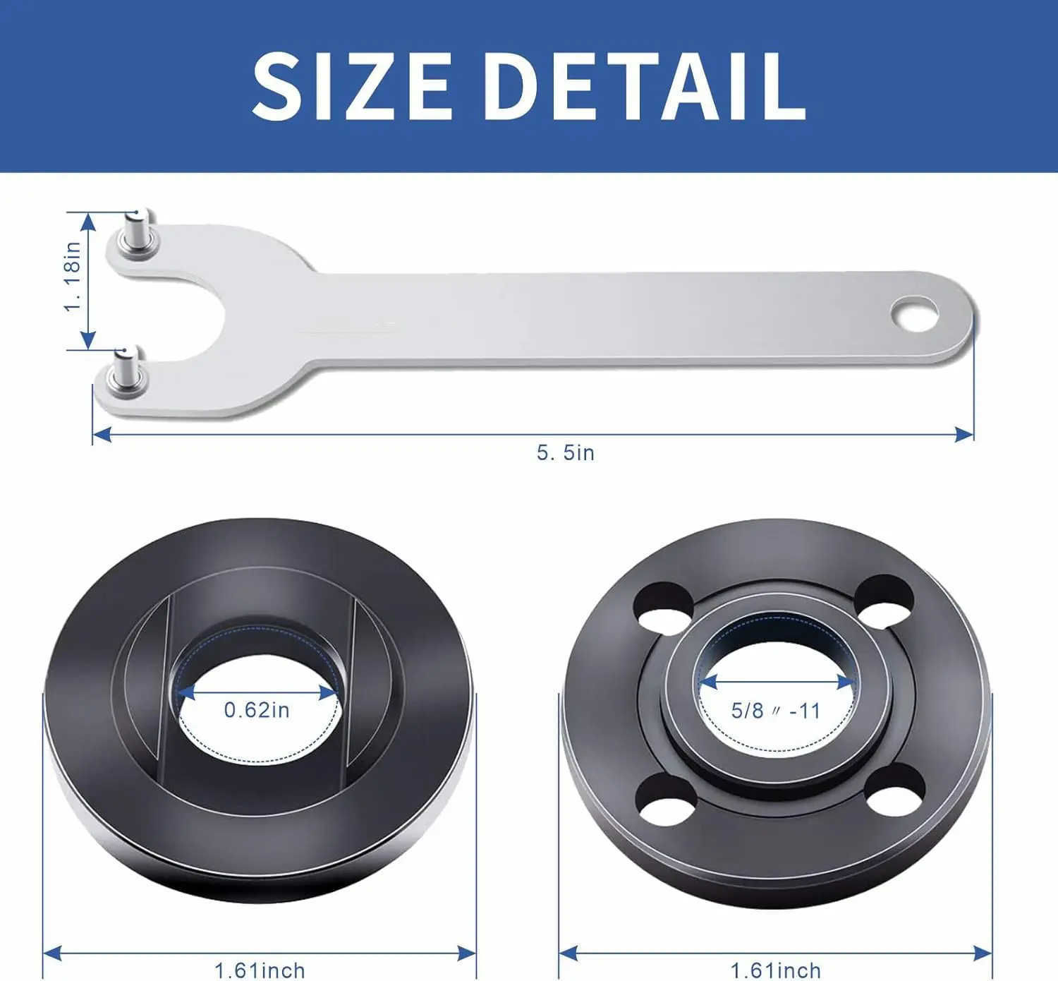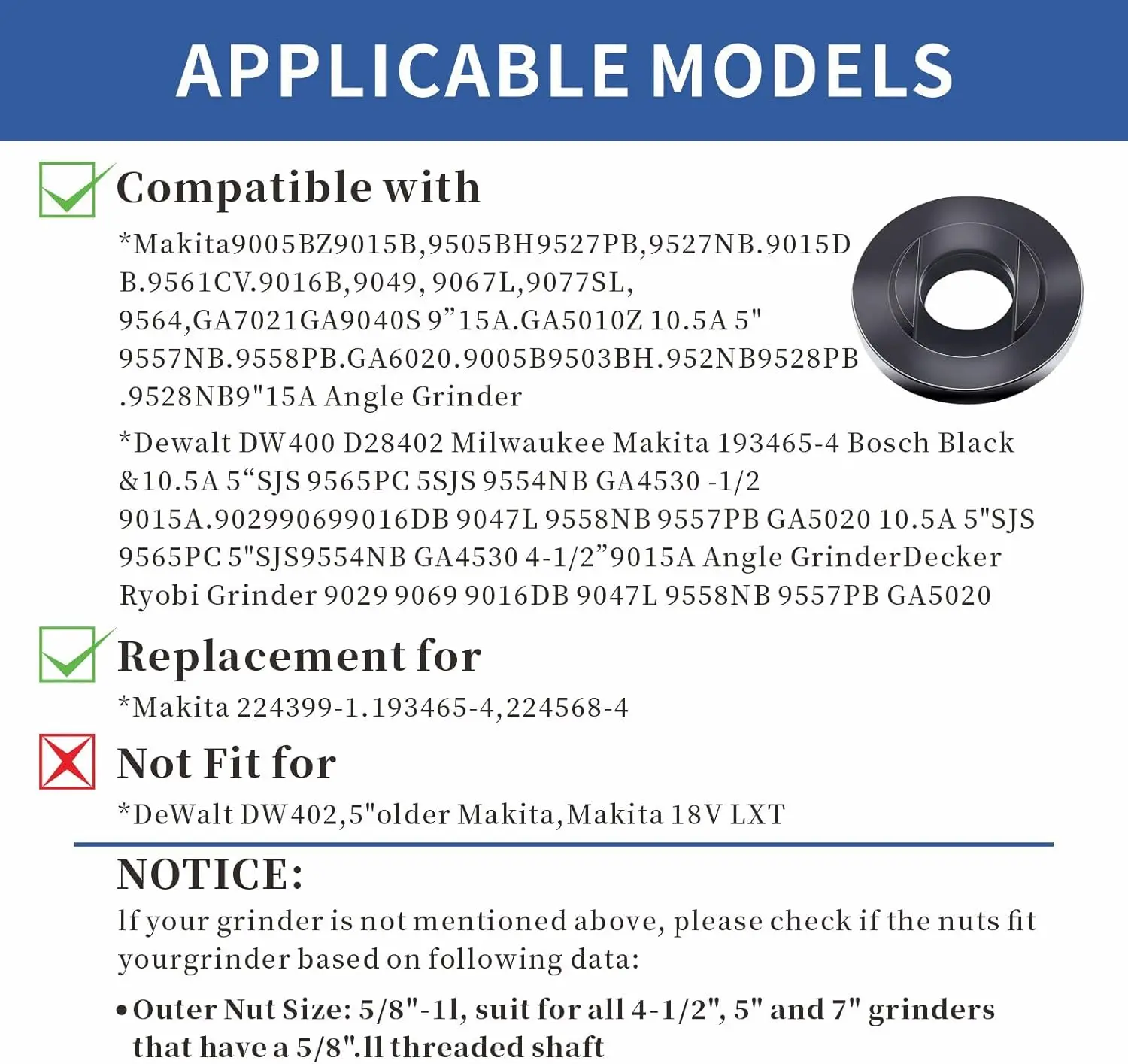 ·EXACT SIZE COMPATIBILITY: angle grinder nuts in this set have an outer nut size of 5/8"-11, making them compatible with all 4-1/2", 5", and 7" grinders that feature a 5/8"-11 threaded shaft. please note that these nuts are not compatible with For Milwaukee 4-1/2” angle grinders.