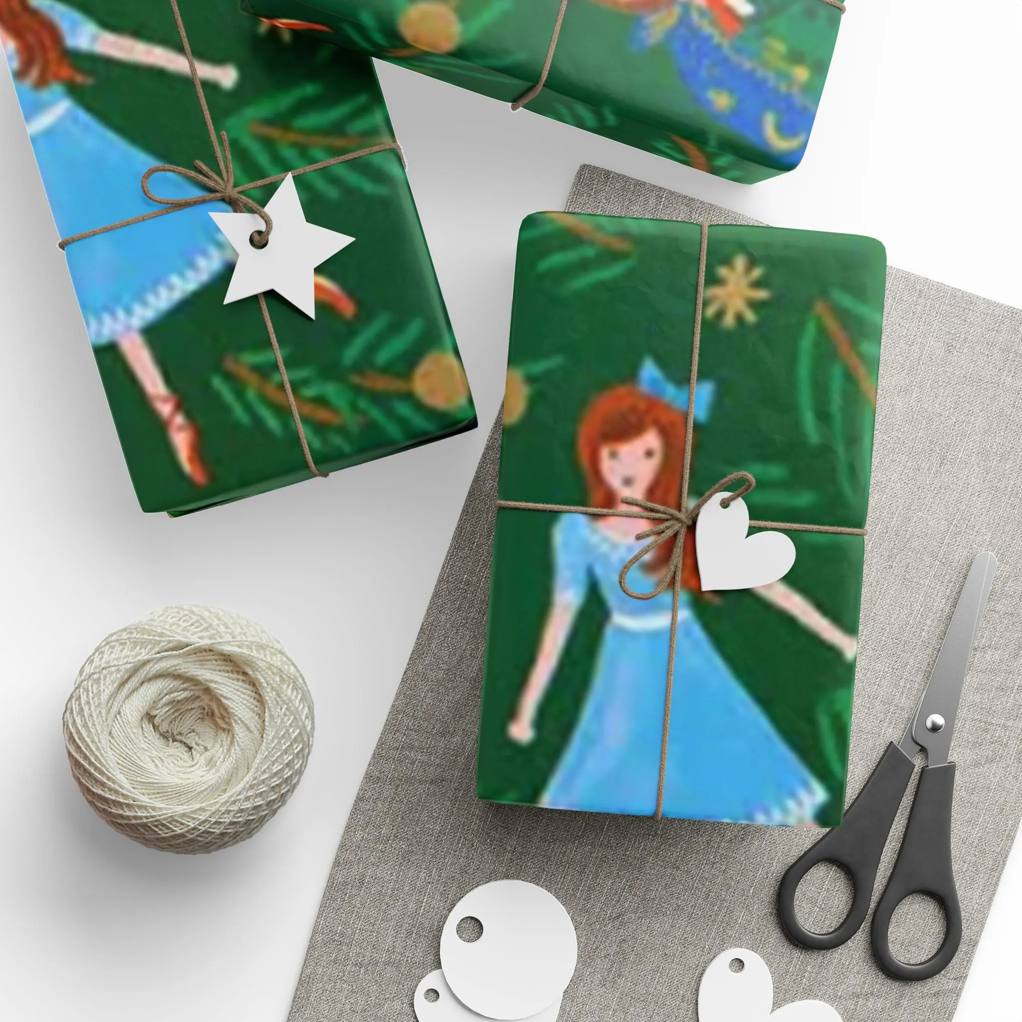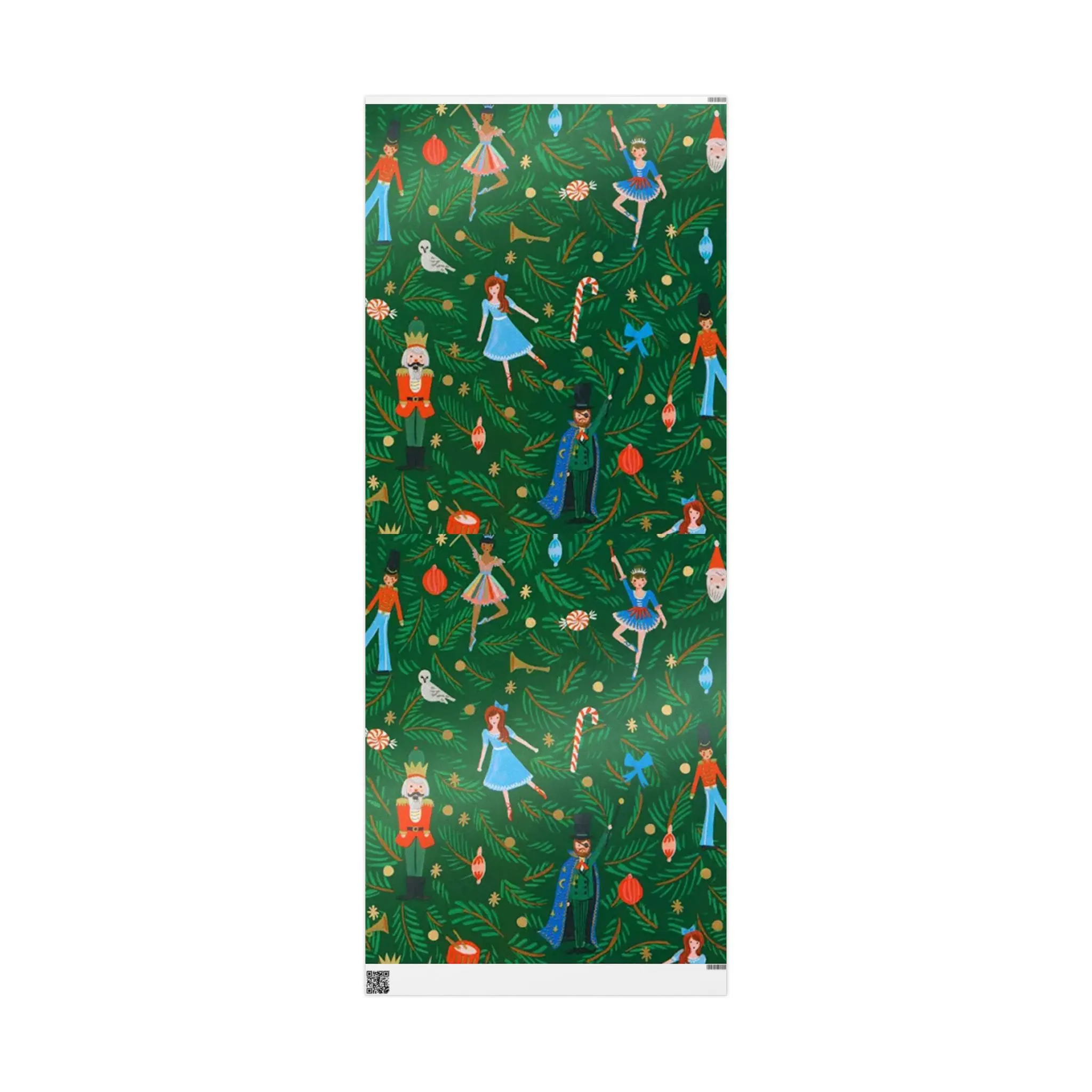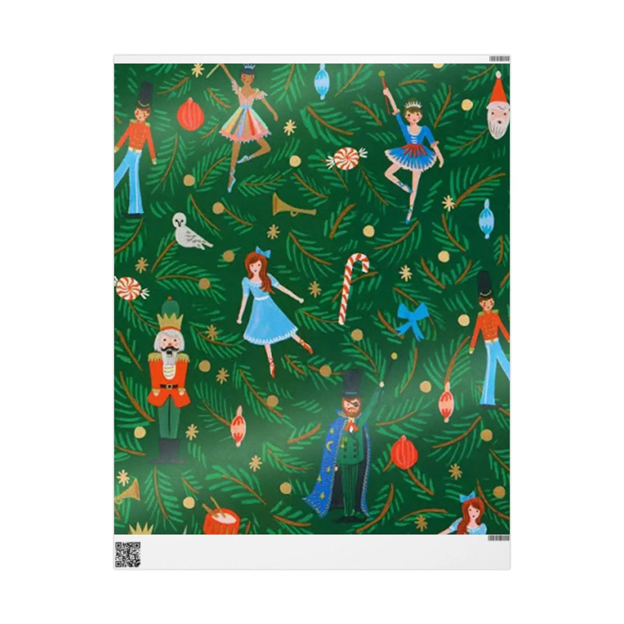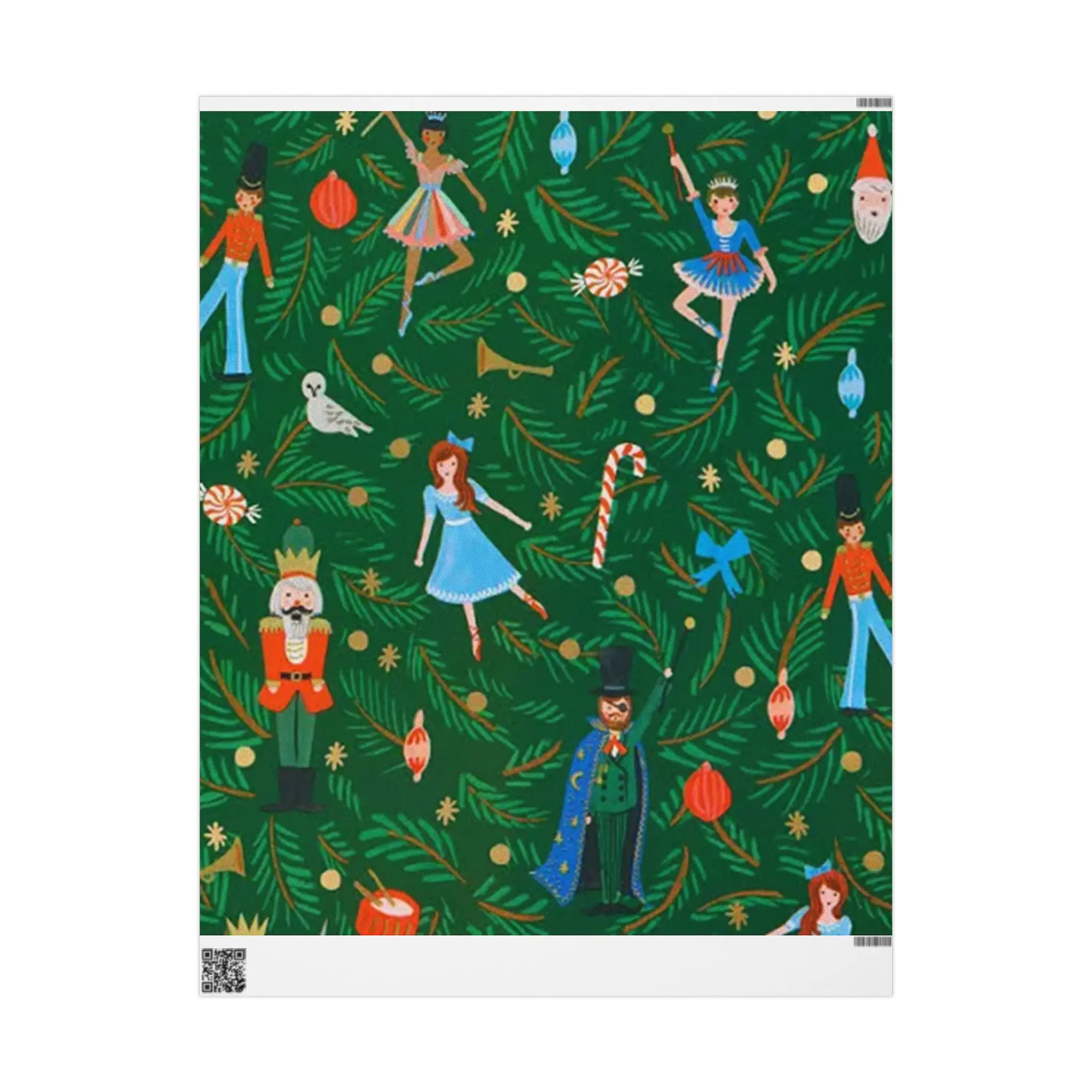A lush, nostalgic wrapping paper that brings the story of the Nutcracker to every gift. Deep evergreen branches form the backdrop while tiny dancers, toy soldiers, candy canes, and whimsical ornaments float across the sheet. The artful pattern reads like a scene from a holiday stage — warm, playful, and a little magical. Printed on sturdy fine art paper with your choice of glossy or matte finish, these wide sheets wrap larger packages smoothly and add theater to mantel-to-mitten exchanges. The visible white trim with a small barcode marker sits unobtrusively at the edge, leaving the illustrated stage uninterrupted where it matters most.