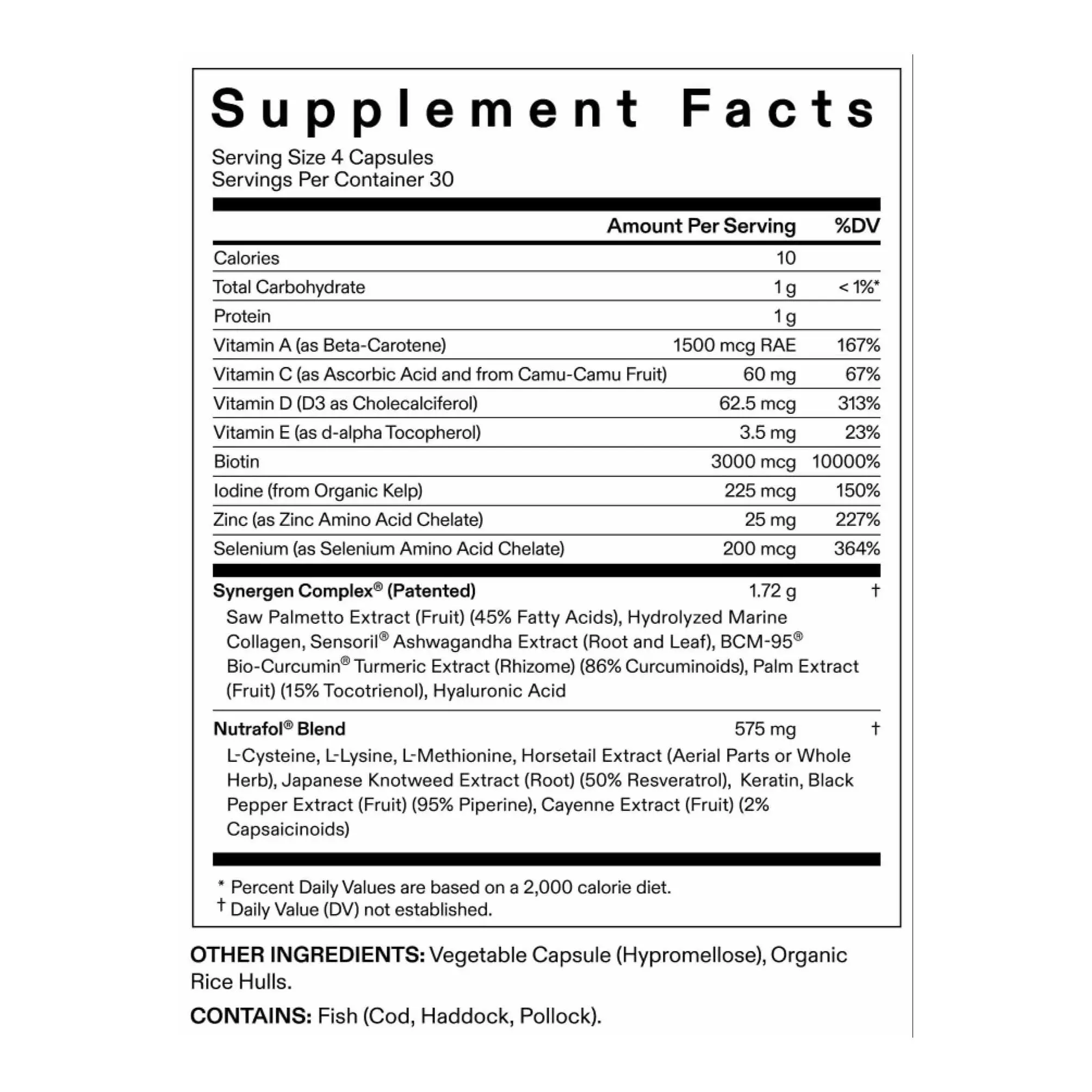 | Ingredients | Vitamin A (as Beta-Carotene),Vitamin C (as Ascorbic Acid and from Camu-Camu Fruit),Vitamin D3 (as Cholecalciferol),Vitamin E (as d-alpha Tocopherol),Biotin,Iodine (from Organic Kelp),Zinc (as Zinc Amino Acid Chelate),Selenium (as Selenium Amino Acid Chelate),Saw Palmetto Extract (Fruit,45% Fatty Acids),Hydrolyzed Marine Collagen,Sensoril® Ashwagandha Extract (Root and Leaf),BCM-95® Bio-Curcumin® Turmeric Extract (Rhizome,86% Curcuminoids),Palm Extract (Fruit,15% Tocotrienol),Hyaluronic Acid,L-Cysteine,L-Lysine,L-Methionine,Horsetail Extract (Aerial Parts or Whole Herb),Japanese Knotweed Extract (Root,50% Resveratrol),Keratin,Black Pepper Extract (Fruit,95% Piperine),Cayenne Extract (Fruit,2% Capsaicinoids),Vegetable Capsule (Hypromellose),Organic Rice Hulls,Contains Fish (Cod,Haddock,Pollock). |