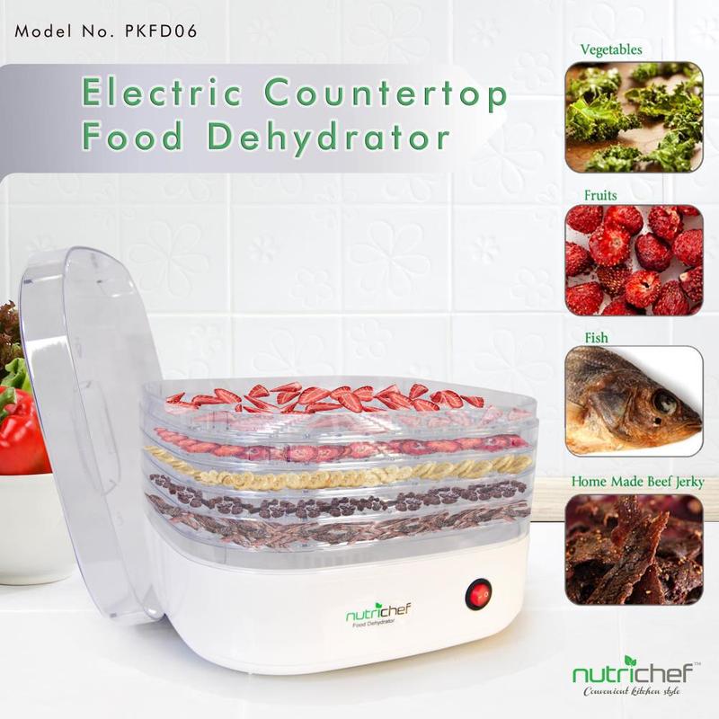 Simply insert your food into the trays and hit the switch to activate a new and healthier level of food preparation. The NutriChef Kitchen Dehydrator effectively works to remove moisture, drying your food and reducing spoilage. The compact tabletop size and multi-level trays allow for enhanced air-flow, dehydrating food for prolonged shelf-life & preservation. Your food will last longer and the removal of moisture content is far more beneficial than canning or freezing. Dehydration with NutriChef retains up to 97% of the food's nutritional value and is scientifically tested to make your food last longer -- and best of all, it still tastes great! Once dried, your food will retain their original vitamins, minerals and flavor! Prepare foods like meat, fish, poultry, fruits, vegetables and more! Save time, save money and save valuable cabinet space since the dehydration process shrinks your food, making it great for food storage or stocking up for the winter. It works great with a wide variety of food groups and is perfect for preparing healthy, oil-free veggie chips for the kids -- or hardy beef jerky for dad. Reduce spoilage and enjoy enhanced food preservation with the NutriChef Food Dehydrator.