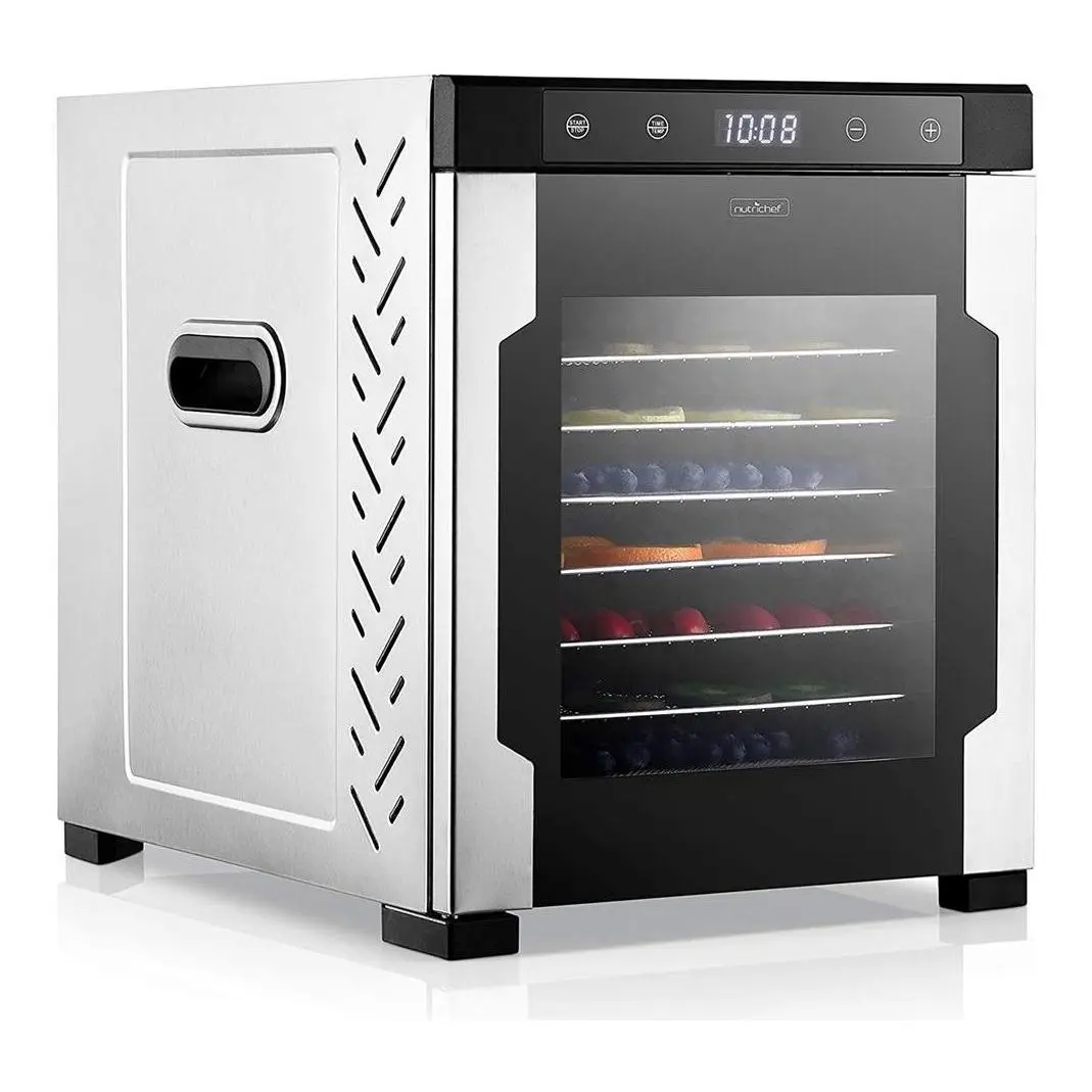 Food grade Stainless Steel and Glass Front Door 10 layer Living Drawer(15.5 X 15.34) Electronic Probe and Timing Temperature Control 360 Hot Air Circulation Large Capacity with 10 trays and Up to 13 lbs of Food Dehydrate at once Switch Door Magnetic Induction Built in Rear mounted Motor and Internal Fan Circulates Warm Air Easy to Store and Clean Safe and Quiet to Use Touch Control LED Display Automatic Shut Off Memory Function Includes Overheat Protection Included Mesh Screen and Fruit Roll Sheet Free Recipe Book with 50 Original Recipes Adjustable Time and Temperature Perfect Way to Preserve Fruit, Snacks, Vegetables, Bread, Flowers and more Automatic Shut off when Timer is Done Transparent Door allows you to Easy Monitor Air Flow Horizontal (back to front);Stainless Steel Food Dehydrator, Included Mesh Screen, Fruit Roll Sheet, 10 Trays