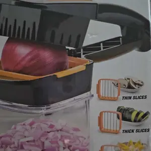 ·5X FASTER CUTTING It is made of stainless-steel razor-sharp blades that can chop or slice vegetables, onions and fruits multiple times in one single squeeze.