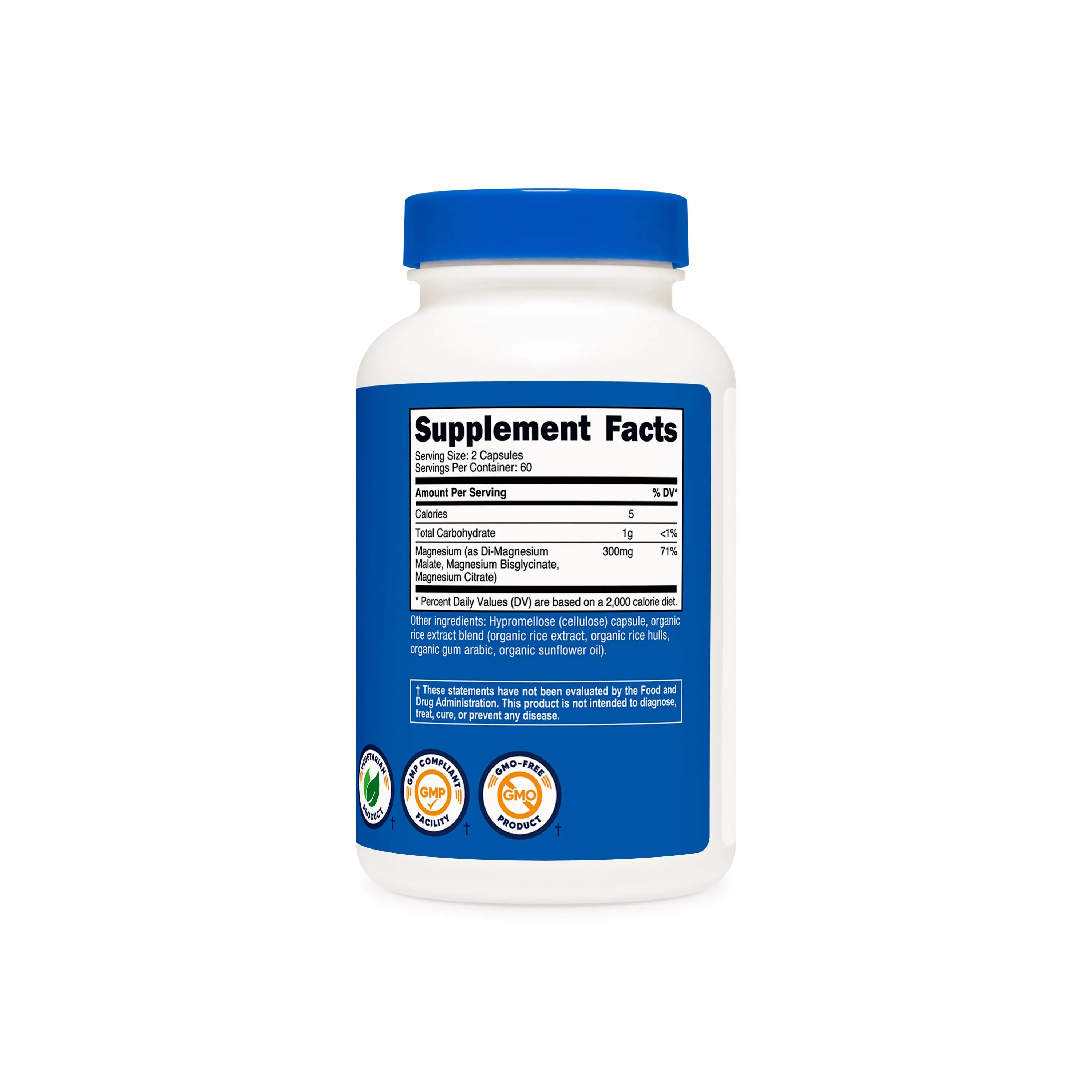 IngredientsMagnesium (As Di-Magnesium Malate,Magnesium Bisglycinate,Magnesium Citrate),Hypromellose (Cellulose) Capsule,Organic Rice Extract Blend (Organic Rice Extract,Organic Rice Hulls,Organic Gum Arabic,Organic Sunflower Oil).