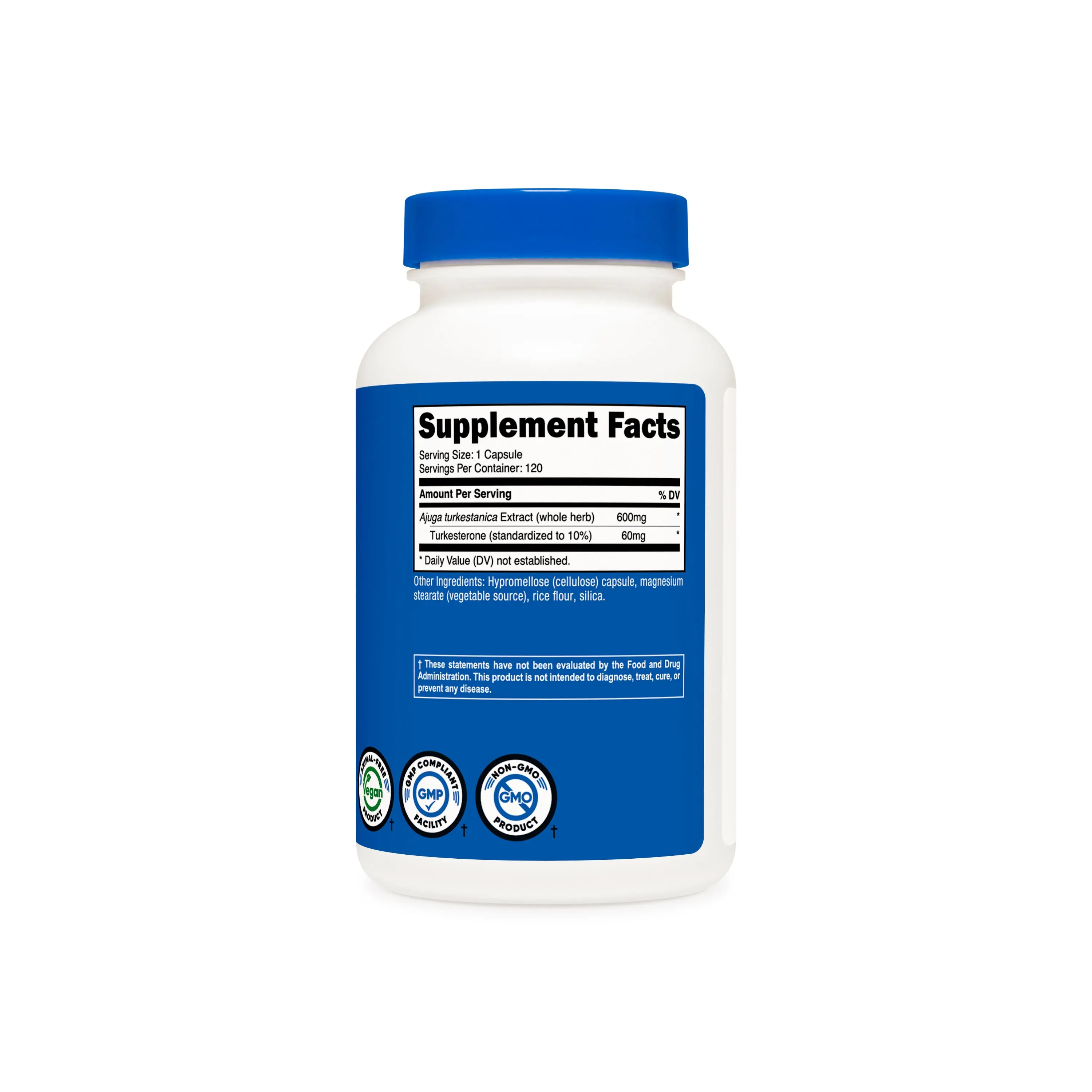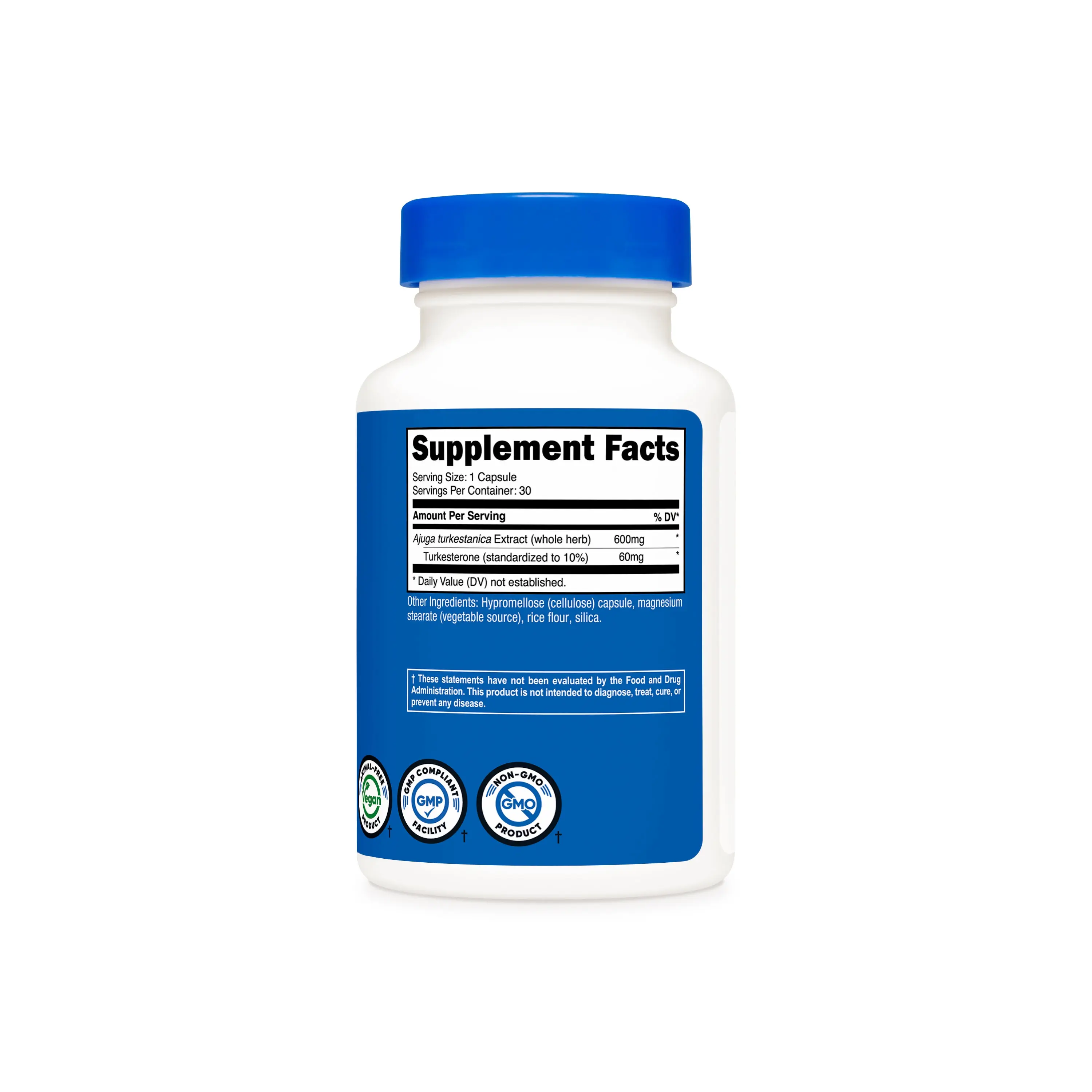 IngredientsAjuga turkestanica Extract (whole herb)(standardized to 10% Turkesterone [providing 60mg]),Hypromellose (Cellulose) Capsule,Magnesium Stearate (Vegetable Source),rice flour,Silica.