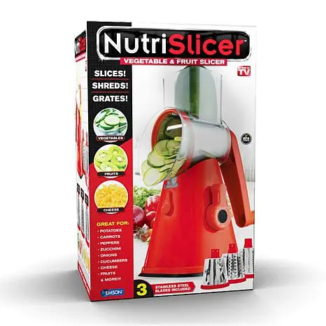 Nutrislicer 3-in-1 Rotating Mandoline & Countertop Food Slicer/Grater This kitchen countertop food slicer helps you quickly shred, grate, and slice any vegetables, cheese, nuts and more. Everything is effortless with the easy-to-use interchangeable slicers and graters. Just place your ingredient in the top of the Nutrislicer and turn the handle for sharply cut ingredients in seconds. This 3-in-1 mandoline vegetable slicer cuts, chops, slices, and grates foods up to 18 times faster than by hand.  What You Get Food Slicer (3) Drums (Slice, Grate, Shred)