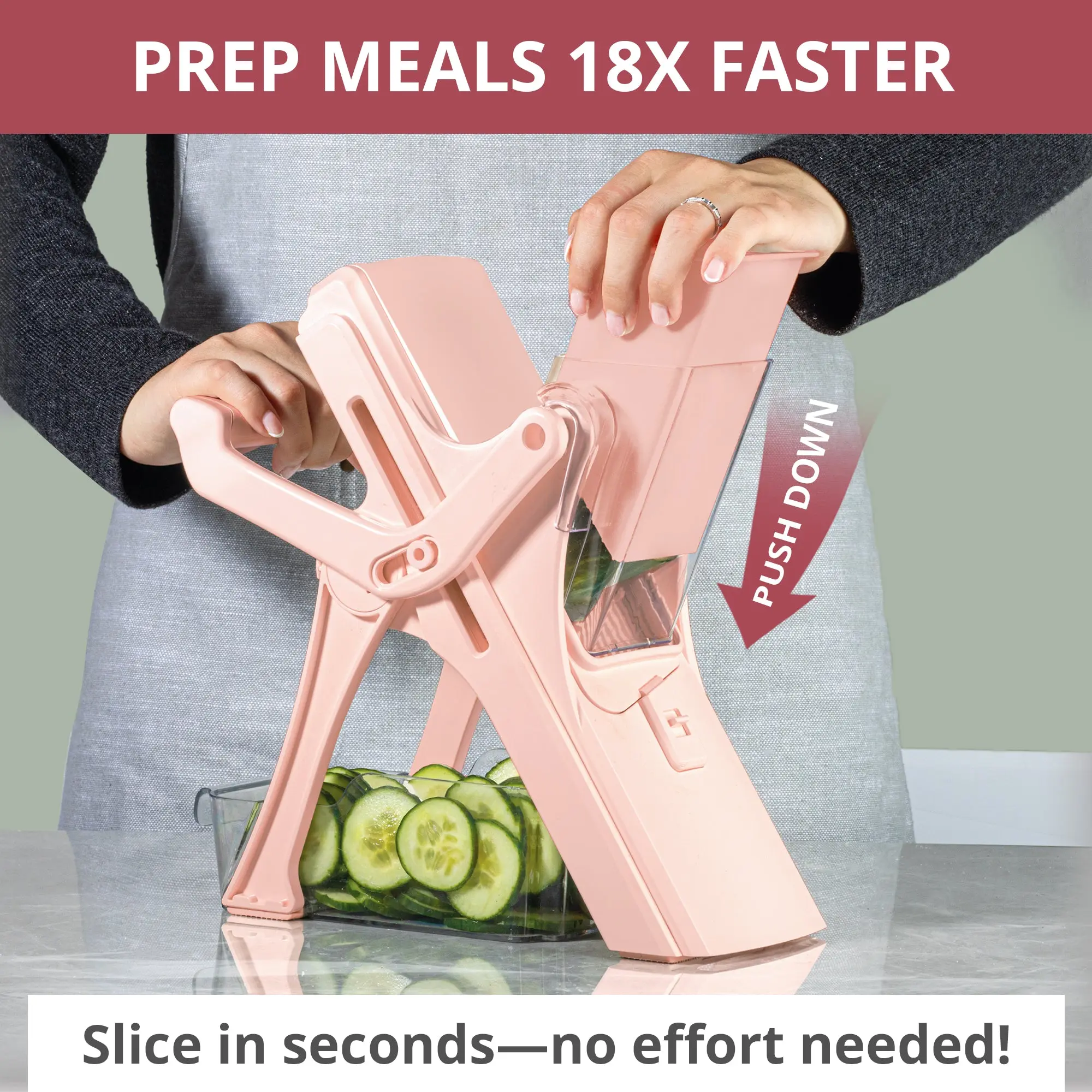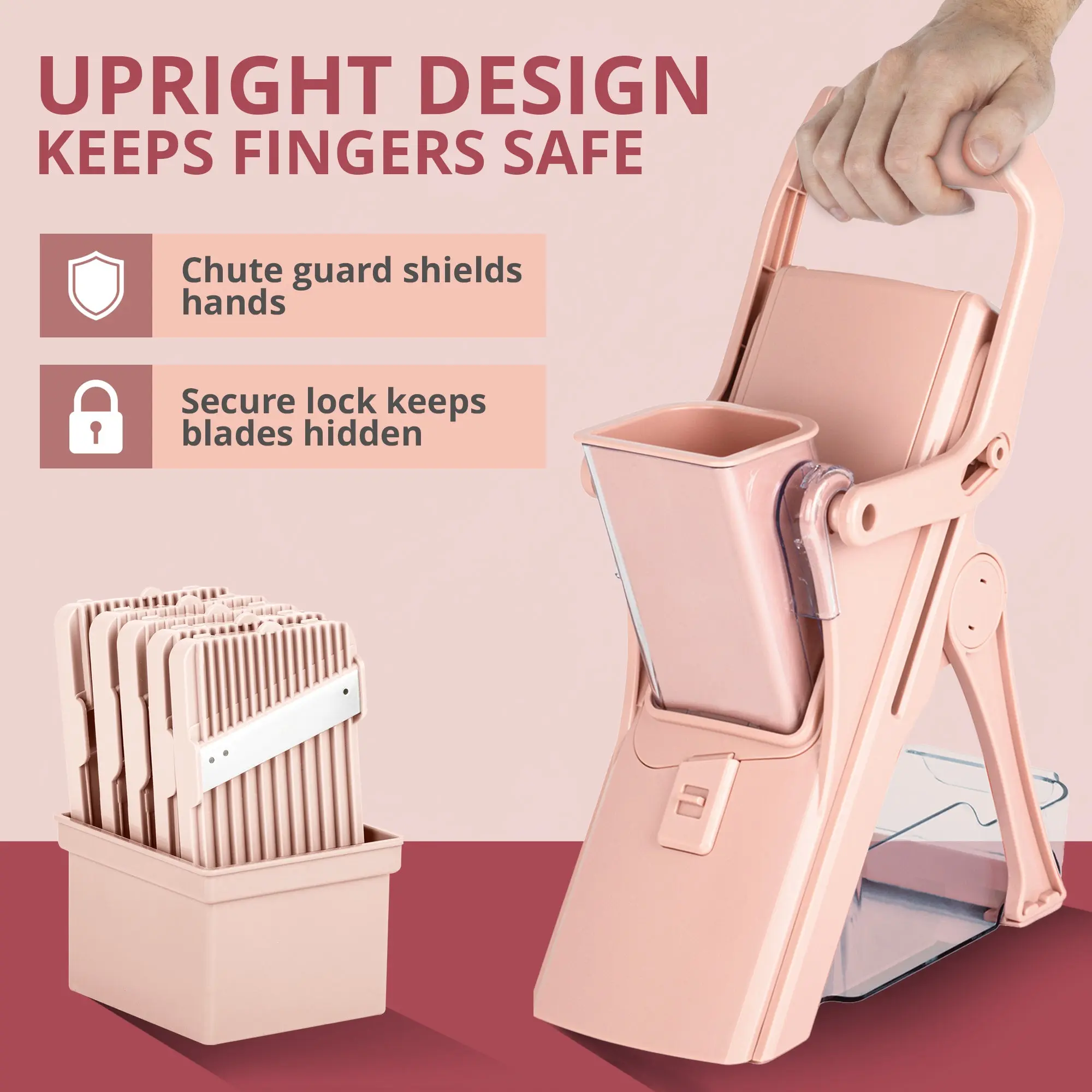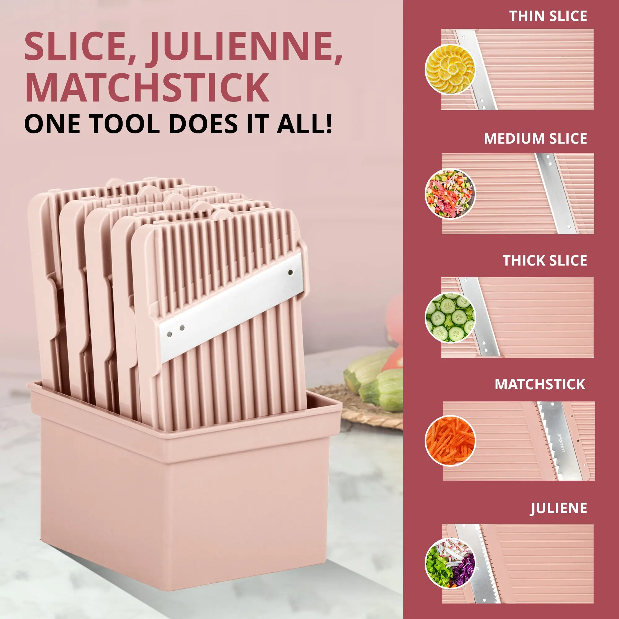 ·5 Interchangeable Stainless Steel Blades: This versatile kitchen gadget comes with 5 ultra-sharp blades, including thin, medium, and thick slicers, a julienne cutter, and a matchstick blade.