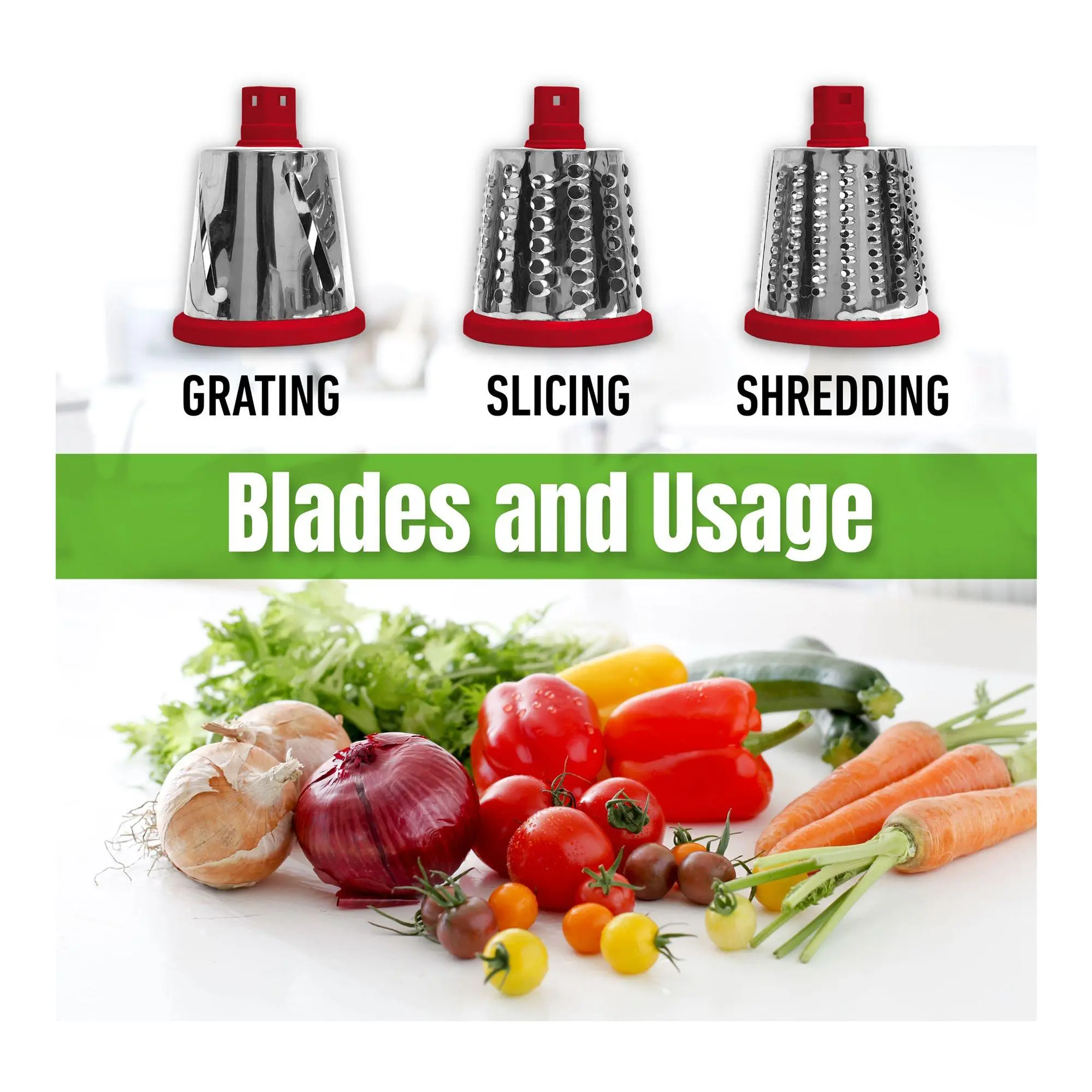 ·Includes base, grating blade, slicing blade, and shredding blade