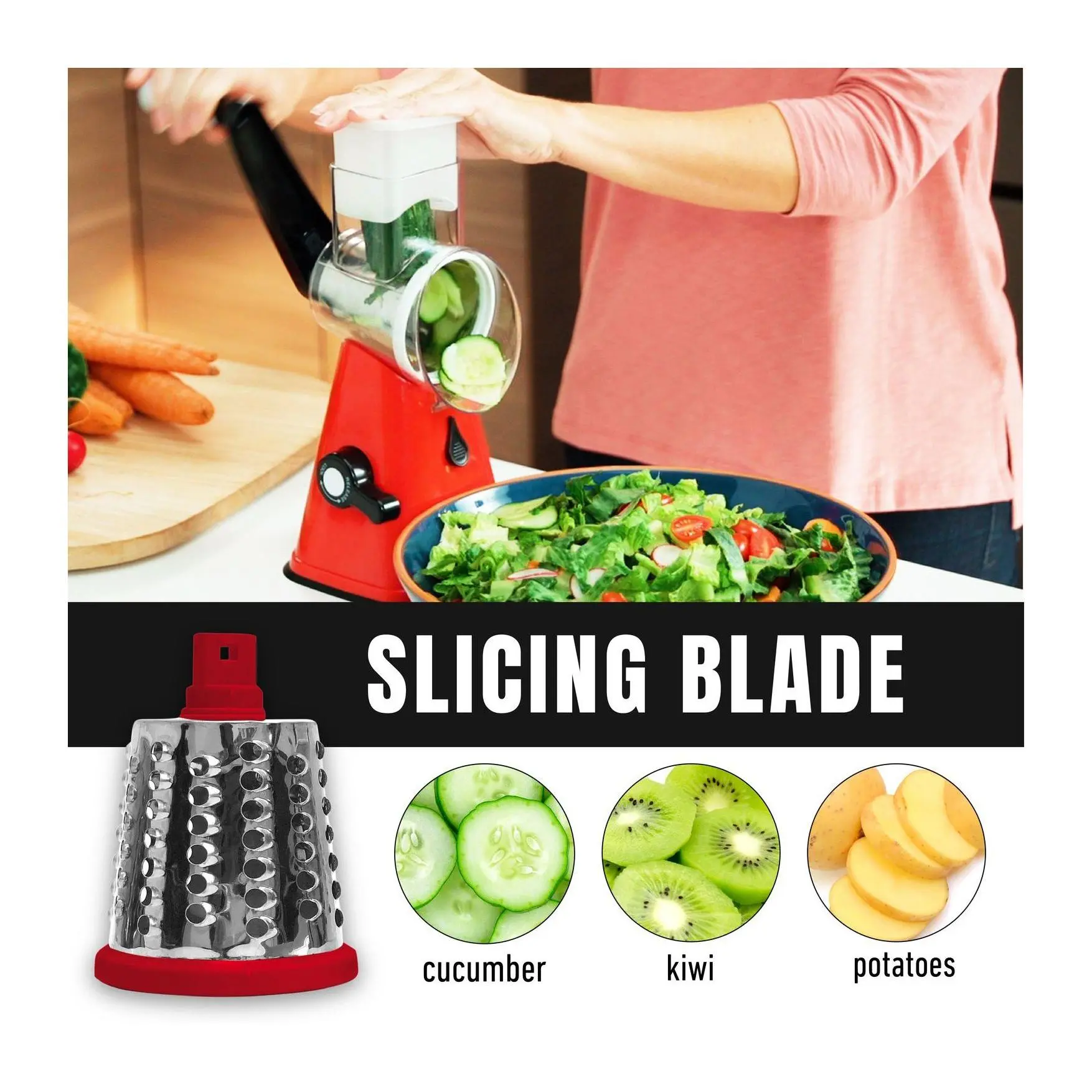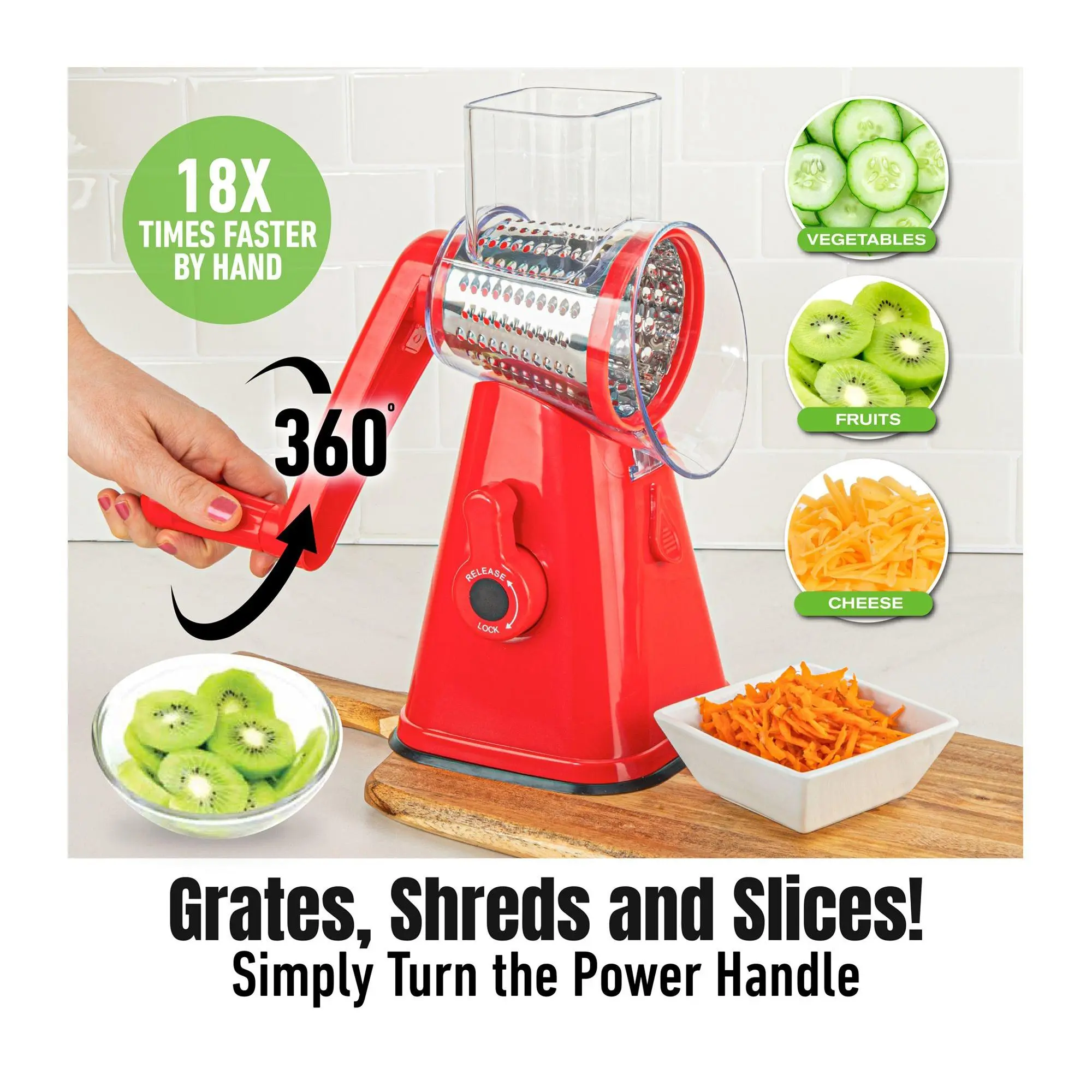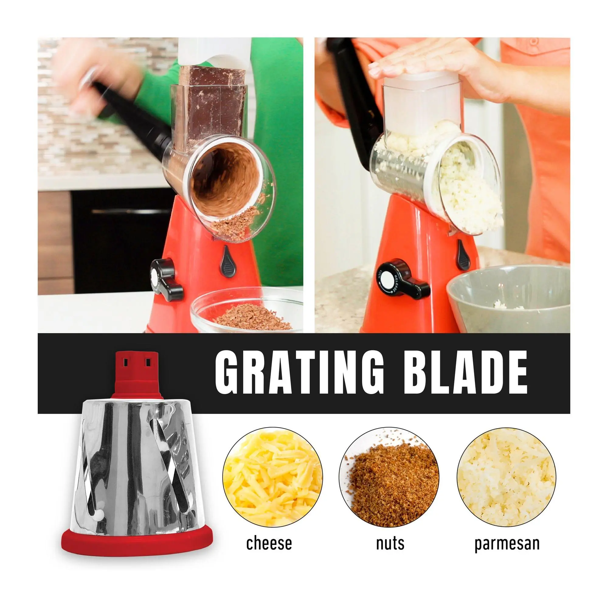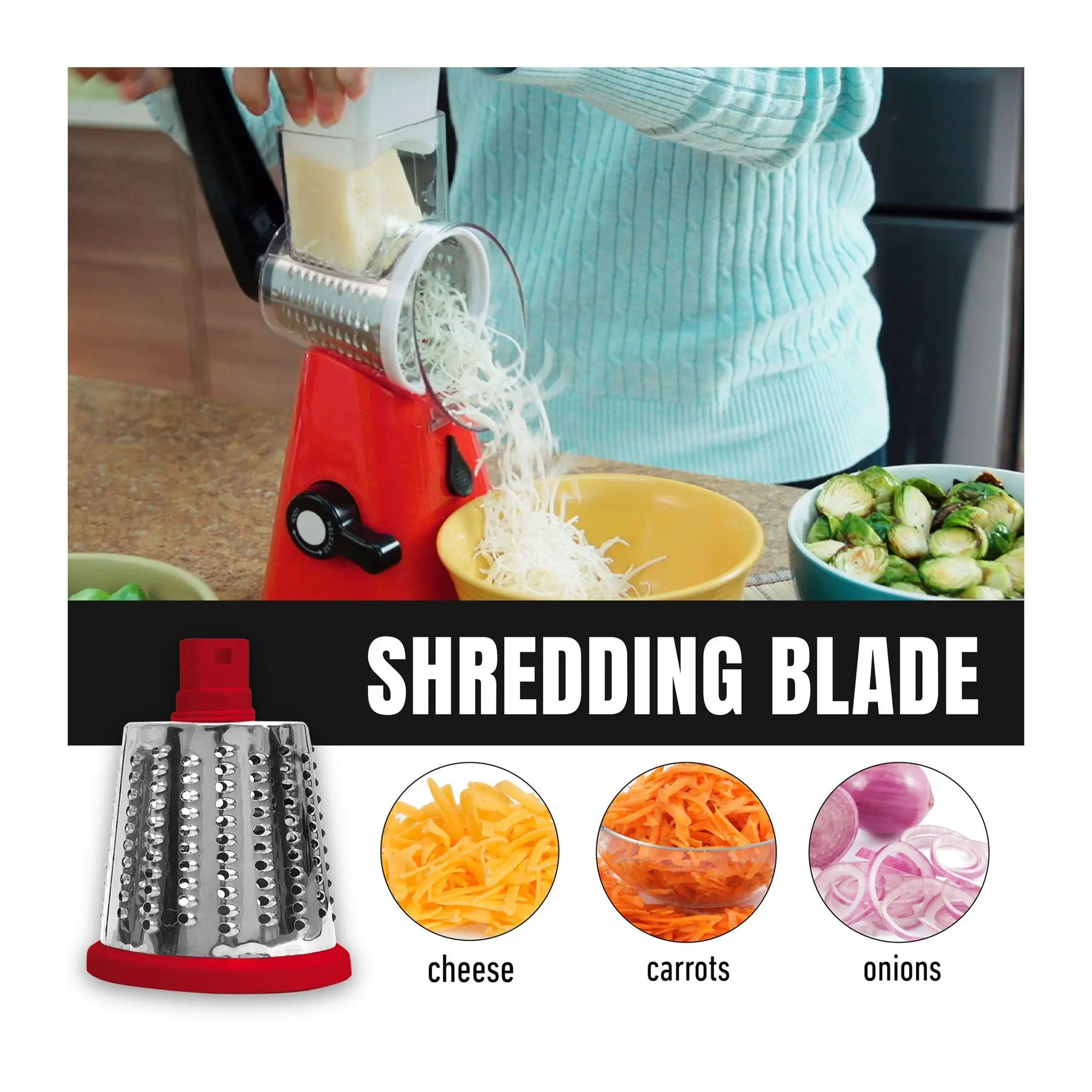 RALLA EN SEGUNDOS Y SIN ESFUERZO Fácil de usar deal para queso, verduras y más Seguro para tus manos Práctico y rápido El aliado perfecto para tu cocina