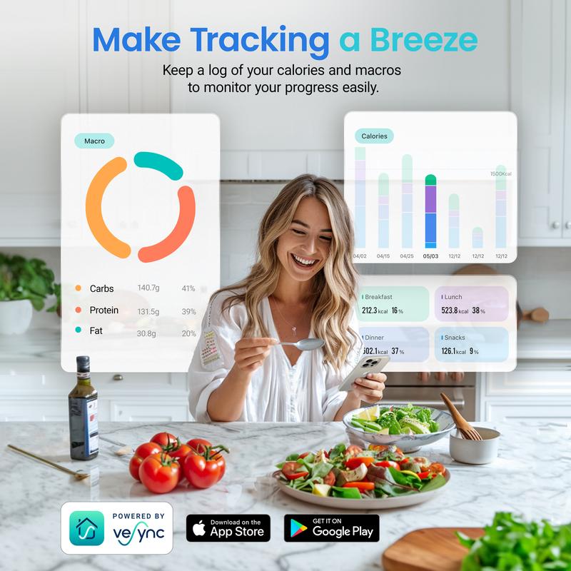 Precise Nutrition Tracking: The Nutrition Scale, through the VeSync app, tracks up to 19 nutrients and supports a database of 1 million foods, helping you control your diet scientifically and generate personalized nutrition reports.