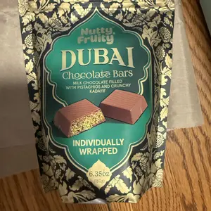 They show a big bag, like 16 ounces, and yes I don’t fully check when ordering, but got a 6 ounce bag with only like 6 pieces. Filling was dry and kind of brownish not green. Have had a few different Dubai choc and this is the worst I’ve had…