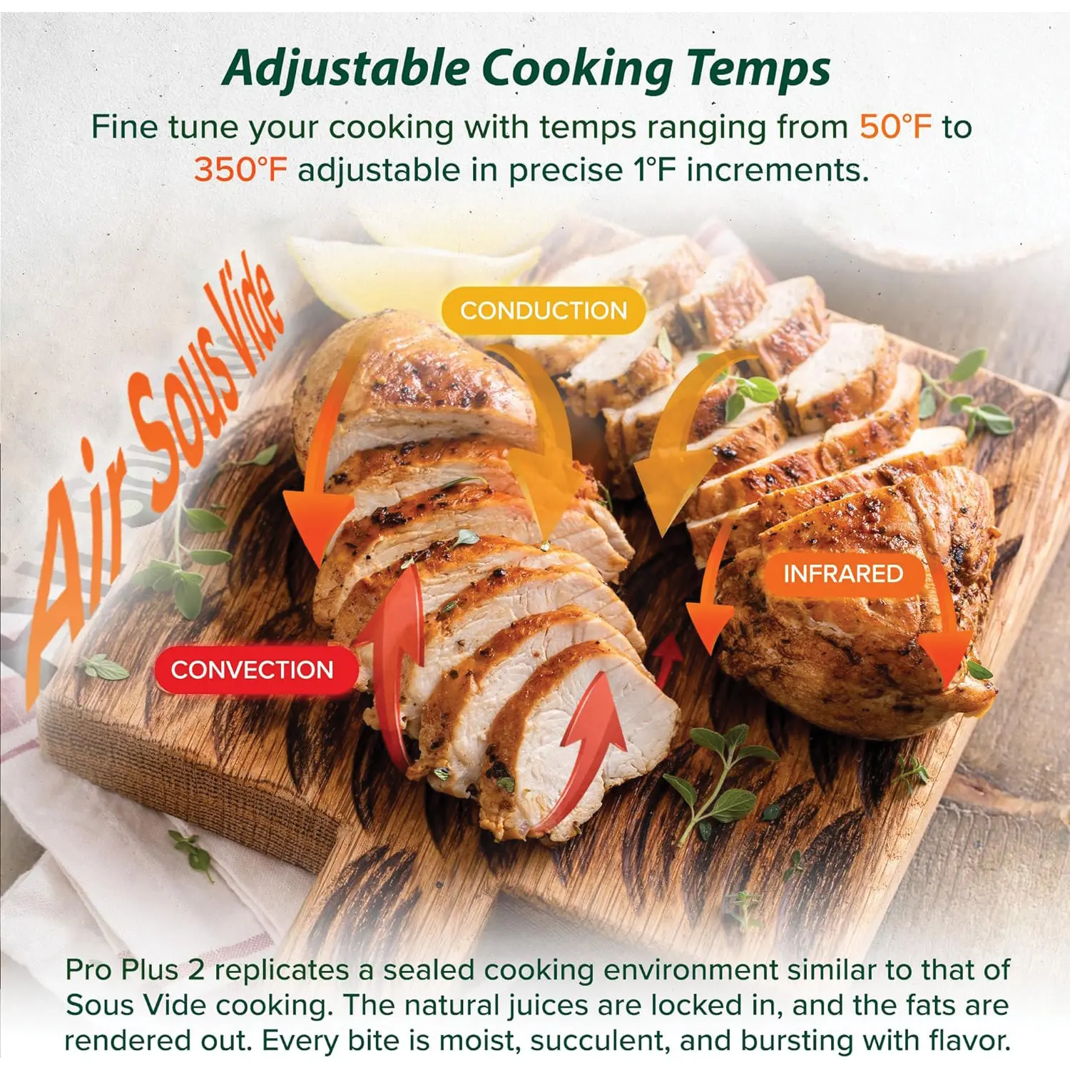 VERSATILITY REDEFINED â Whether it is frozen or fresh, Pro Plus 2 excels in versatility. Explore a wide range of culinary possibilities from roasting, baking, grilling, searing, steaming, dehydrating to air frying in one appliance. Pro Plus 2 is perfect for chicken, steaks, ribs, fish, shrimp, bacon, and more. Bring creativity and flavor to every dish. Elevate your cooking game with a device that adapts to your culinary aspirations.