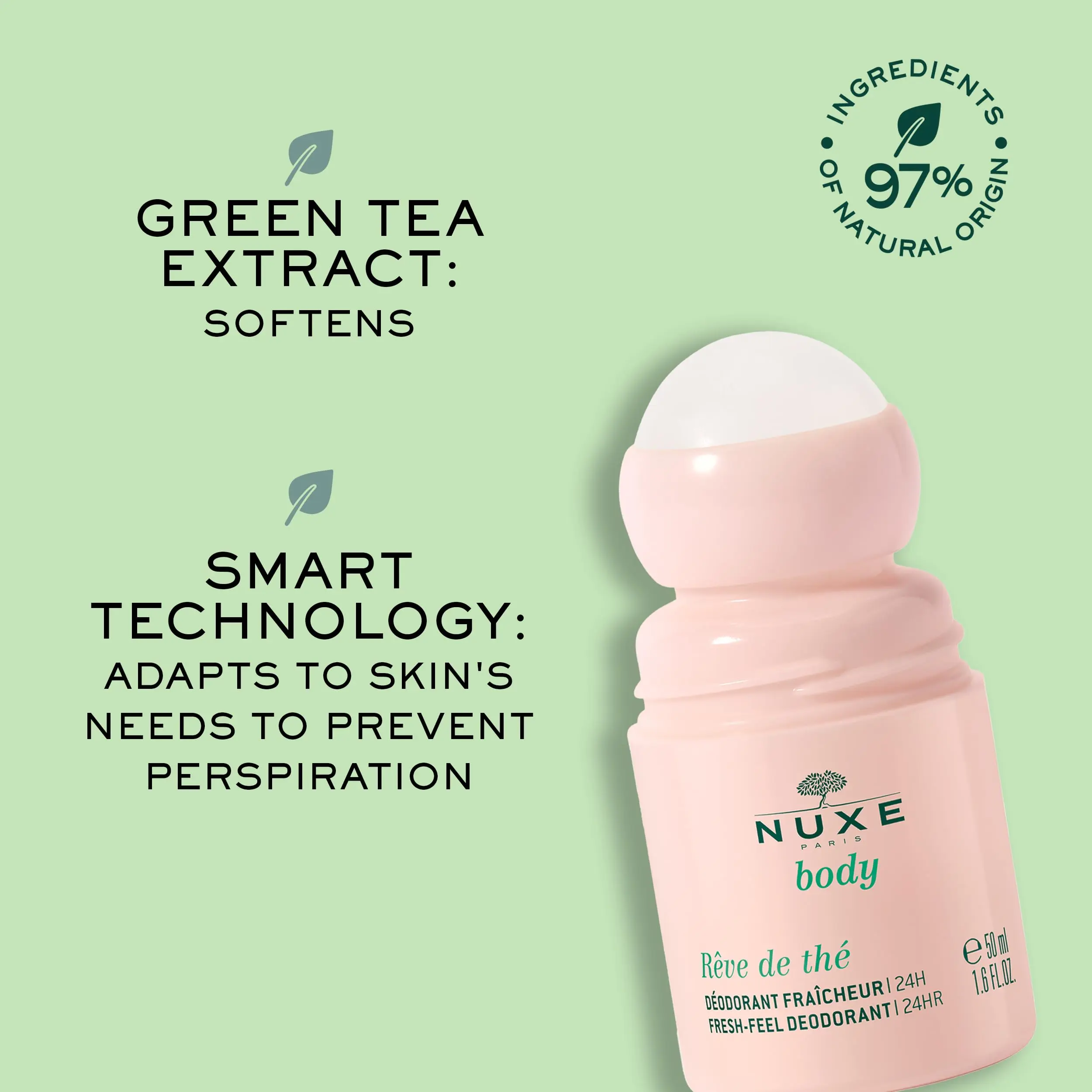 Infused with a revitalizing green tea scent, NUXE Rêve de Thé Fresh-Feel Deodorant is your ultimate daily essential for lasting freshness and confidence. Designed with smart technology, this innovative roll-on features a trio of active ingredients that adapt to your skin’s needs, effectively preventing odours while delivering reliable 24-hour protection*.