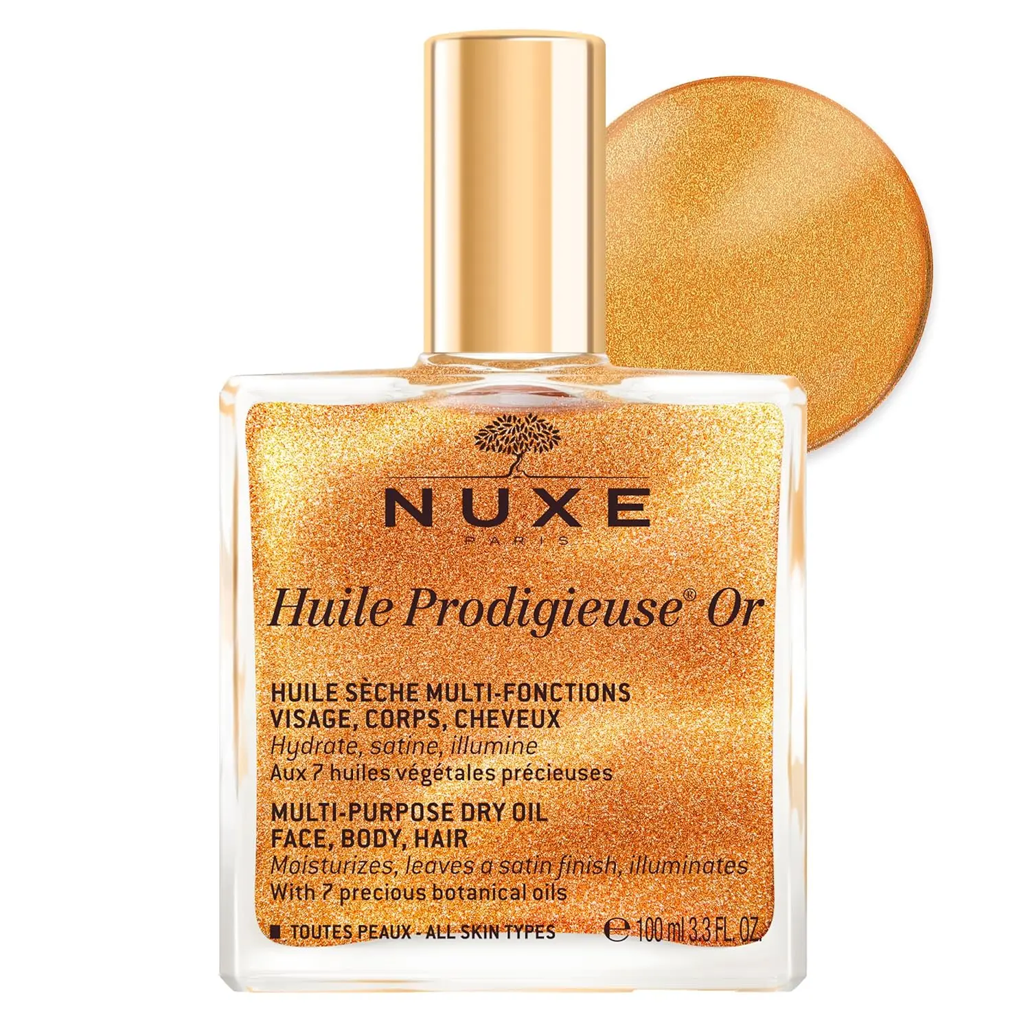 This shimmering dry oil with natural-origin golden pearly particles infuses all skin types and skin tones with an irresistible iridescent glow. It moisturizes, gives a satin feel and illuminates the face, body and hair and moisturizes the skin in a single step. Your skin looks more beautiful, soft and silky, with no oily finish.