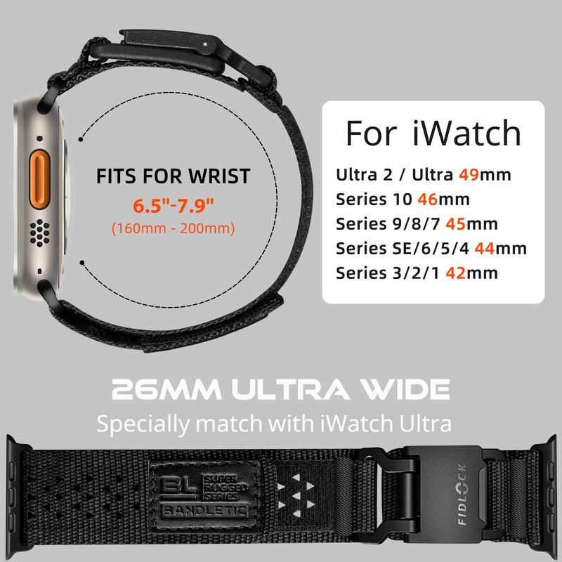 ·【Compatible Models】Bandletic comfortable nylon bands are compatible with iWatch Bands Men, The band compatible with iWatch Ultra 2/Ultra 49mm also fits for iWatch Series 10 46mm, Series 9/8/7 45mm, Series SE/SE2/6/5/4 44mm, Series/3/2/1 42mm. (Replacement band only, No watch included)