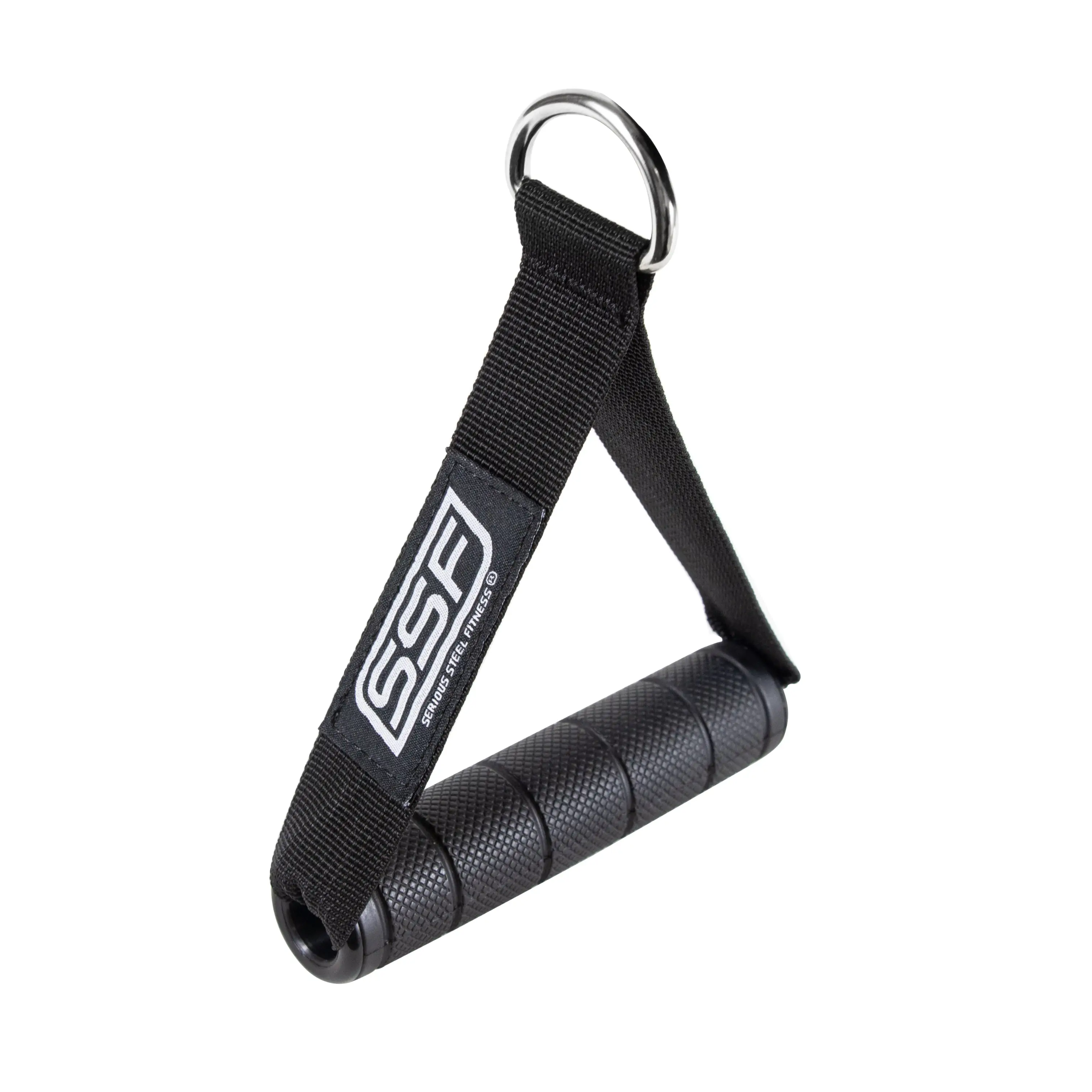 This cable attachment has a rubber-covered plastic tube grip, nylon strap and steel D-ring.