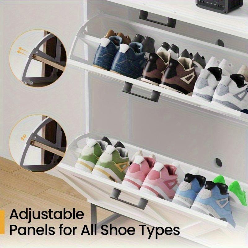 Each flip drawer includes adjustable and removable panels, allowing you to customize storage for different shoe types. From flats and sneakers to heels and mid-calf boots, every pair has its own organized place.