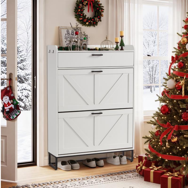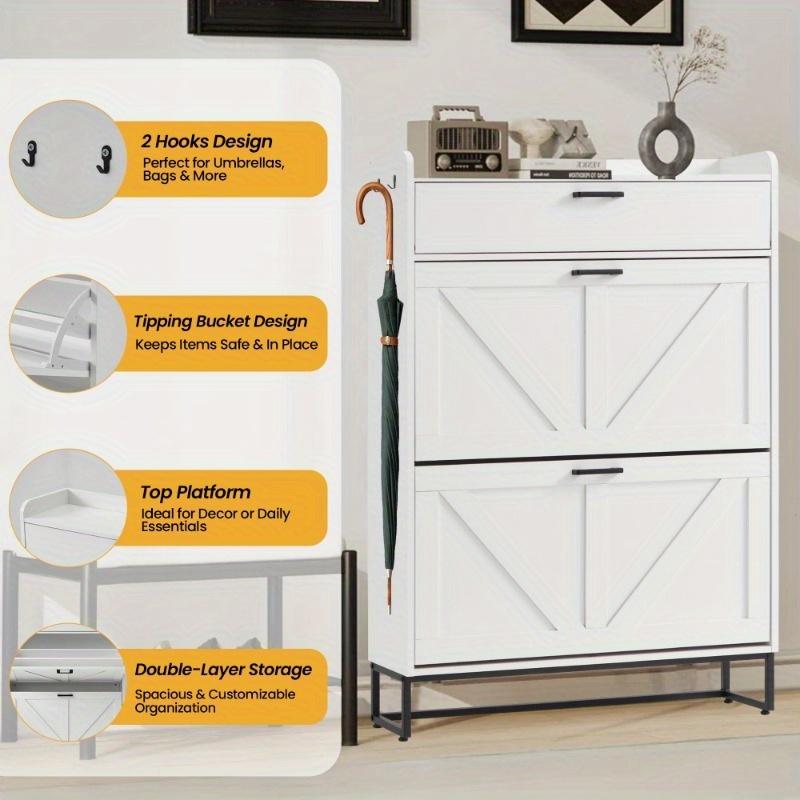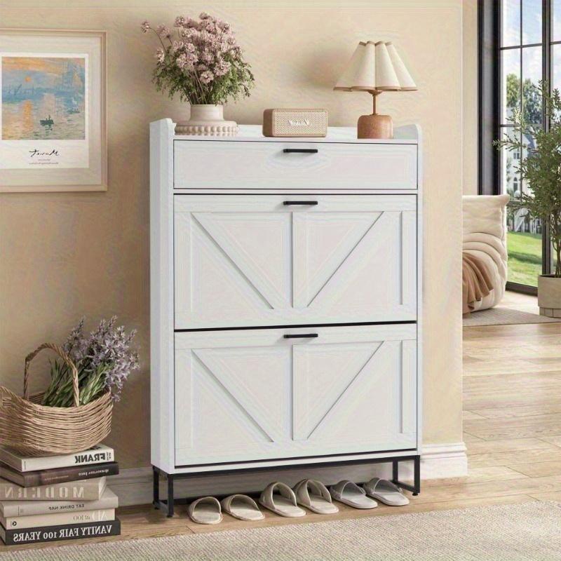 The ultra-slim, freestanding design fits perfectly in narrow hallways or small entryways. Flip-top drawers provide easy access while keeping shoes hidden from dust and pets, helping you make the most of limited space.