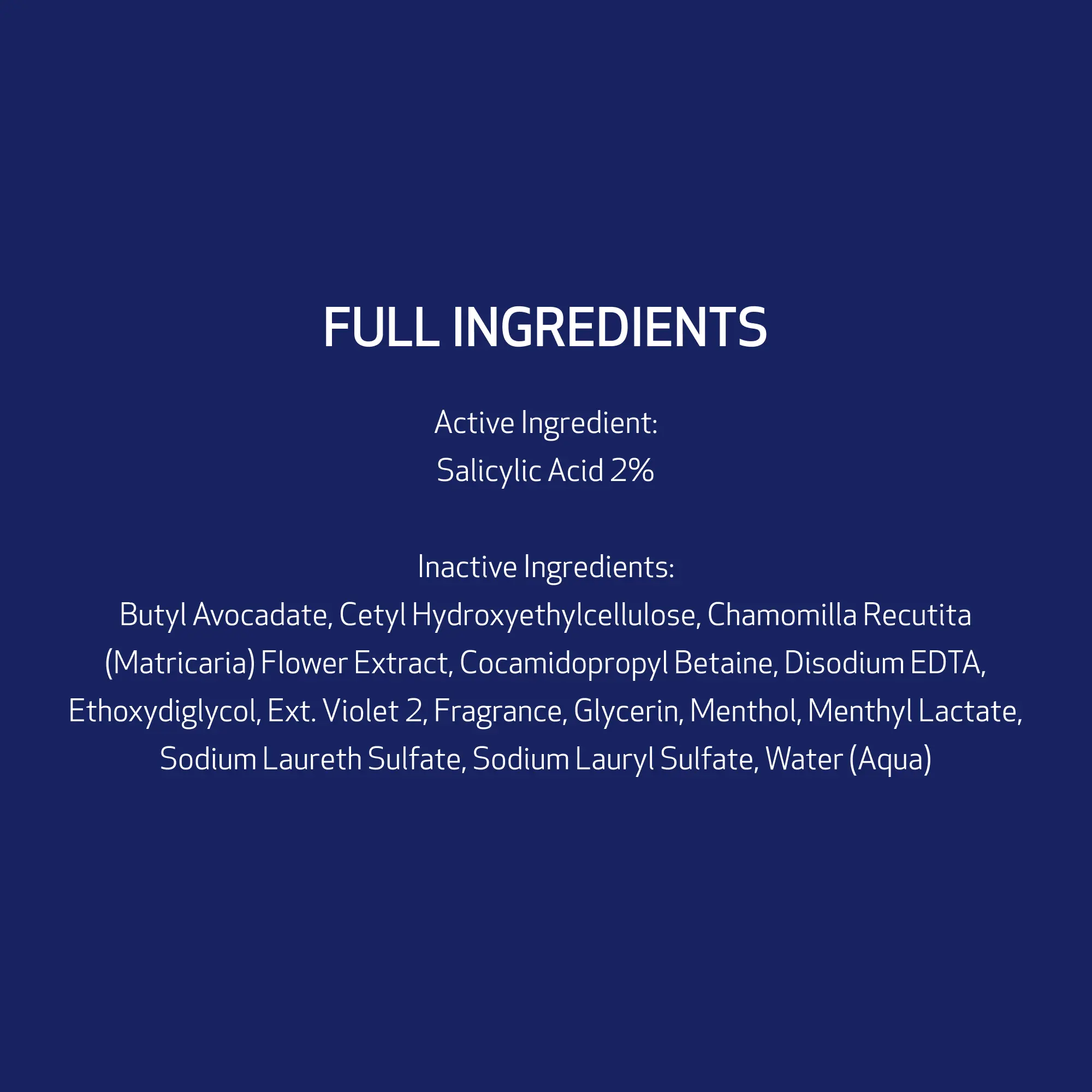 butyl avocadate, cetyl hydroxyethylcellulose, chamomilla recutita (matricaria) flower extract, cocamidopropyl betaine, disodium EDTA, ethoxydiglycol, ext. violet 2, fragrance, glycerin, menthol, menthyl lactate, sodium laureth sulfate, sodium lauryl sulfate, water (aqua)