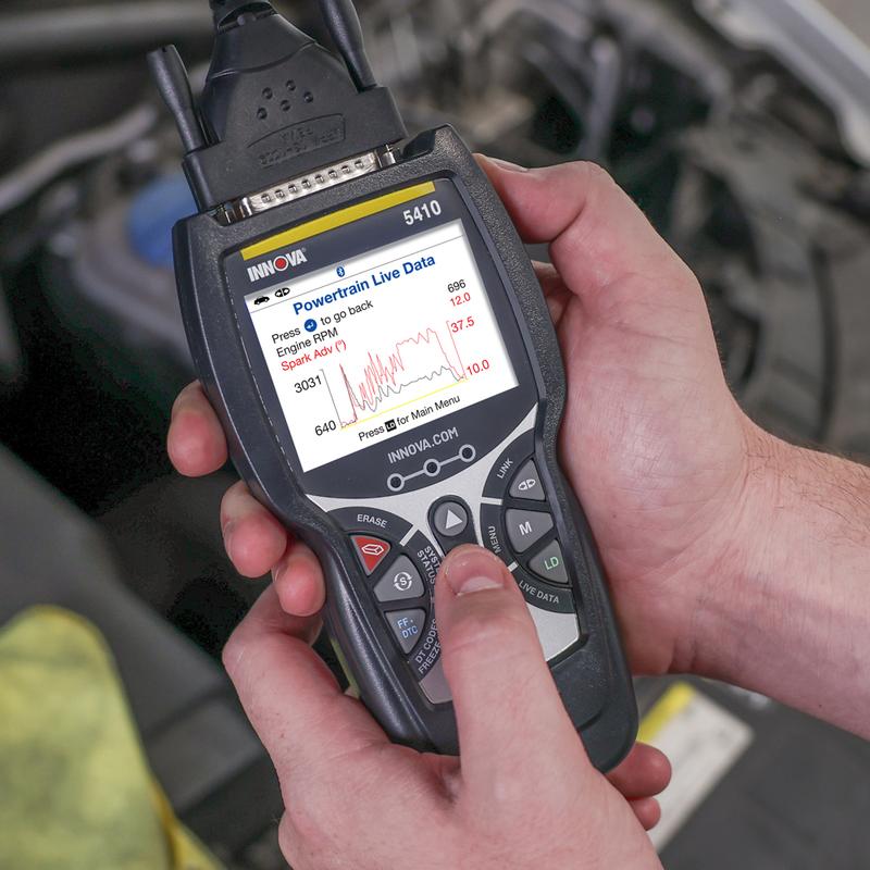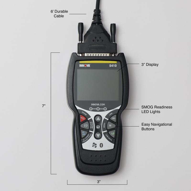 The Innova 5410 OBD2 scanner offers smog check results before state inspection. It clears OBD2 engine codes, checks brake pad life, oil system life, tire pressure, and transmission temperature. Unlike other OBD2 code readers, it's a hybrid battery tester for battery initialization and reads cell voltage.