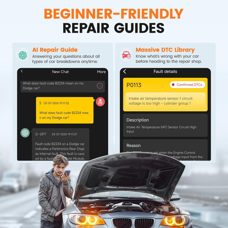 ·Comprehensive Diagnostics – Access detailed diagnostics for engine, airbags, ABS, TPMS, and more, with repair suggestions.