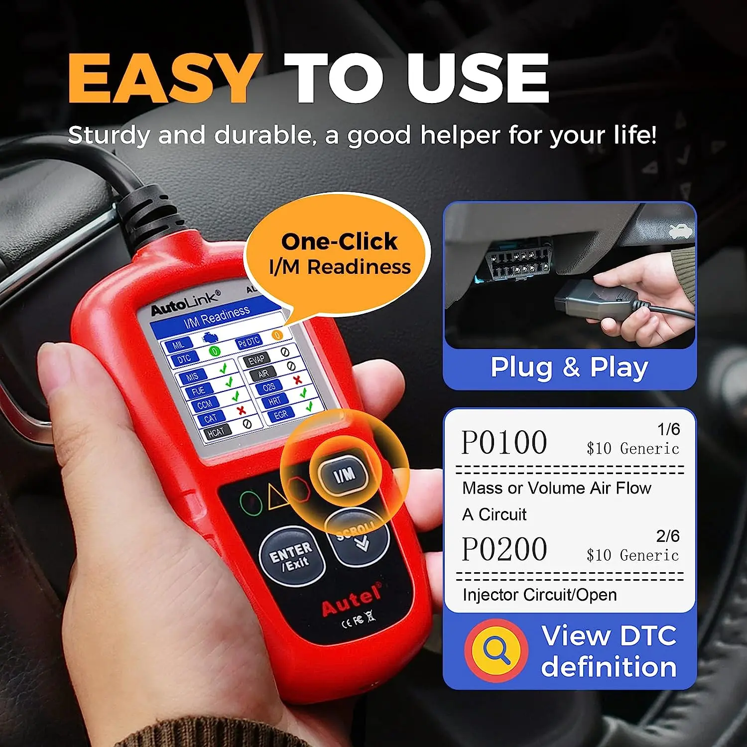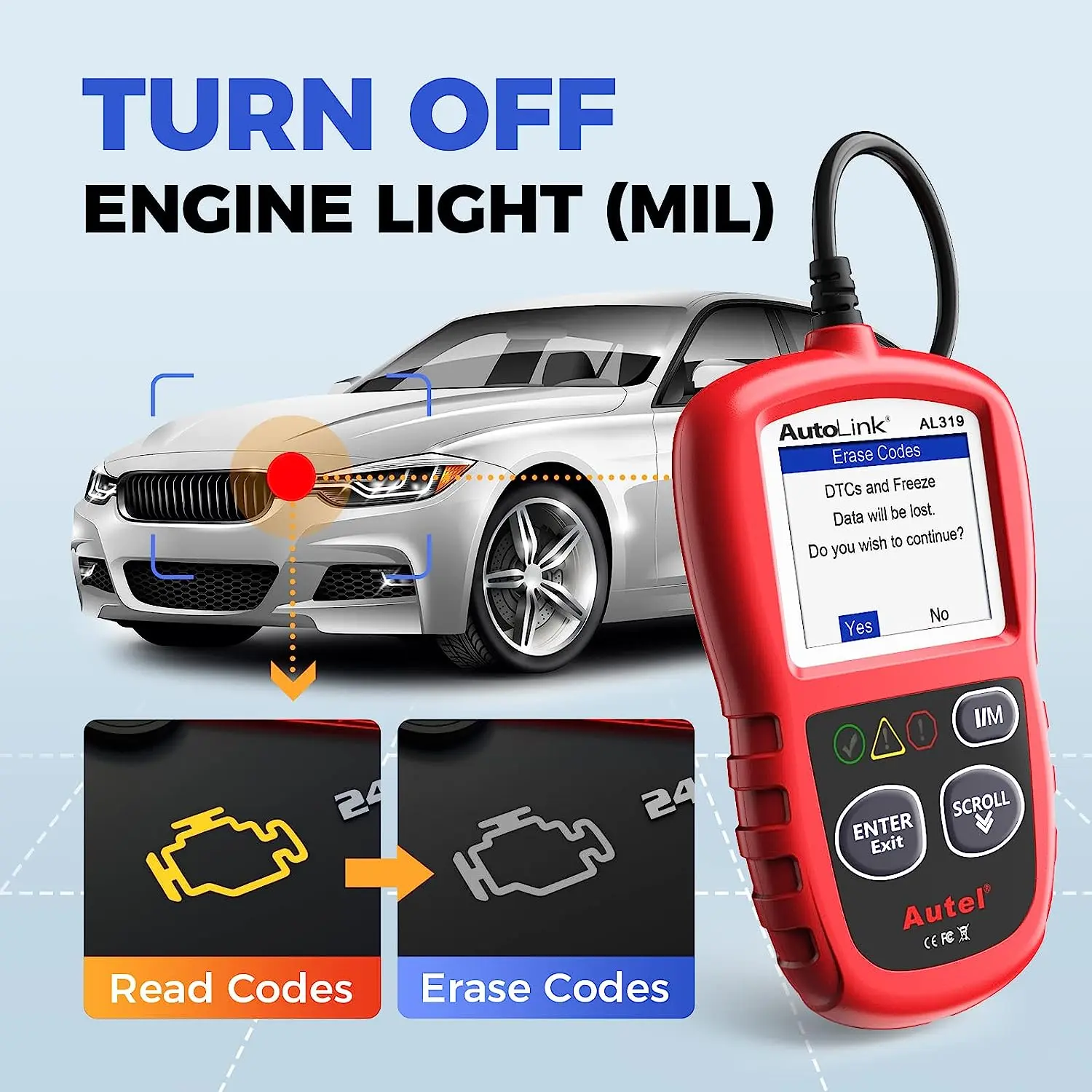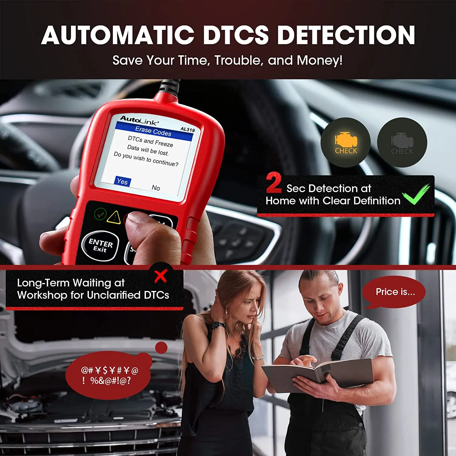 ·【TURN OFF CEL】This AL319 car diagnostic tool supports Reading DTCs, displaying Live Data, Freeze Frame & I/M Readiness etc to figure out the root cause of the Check Engine Light (CEL) and turning it off, to help you detect any potential problems, and to avoid excessive costs for unnecessary repairs.