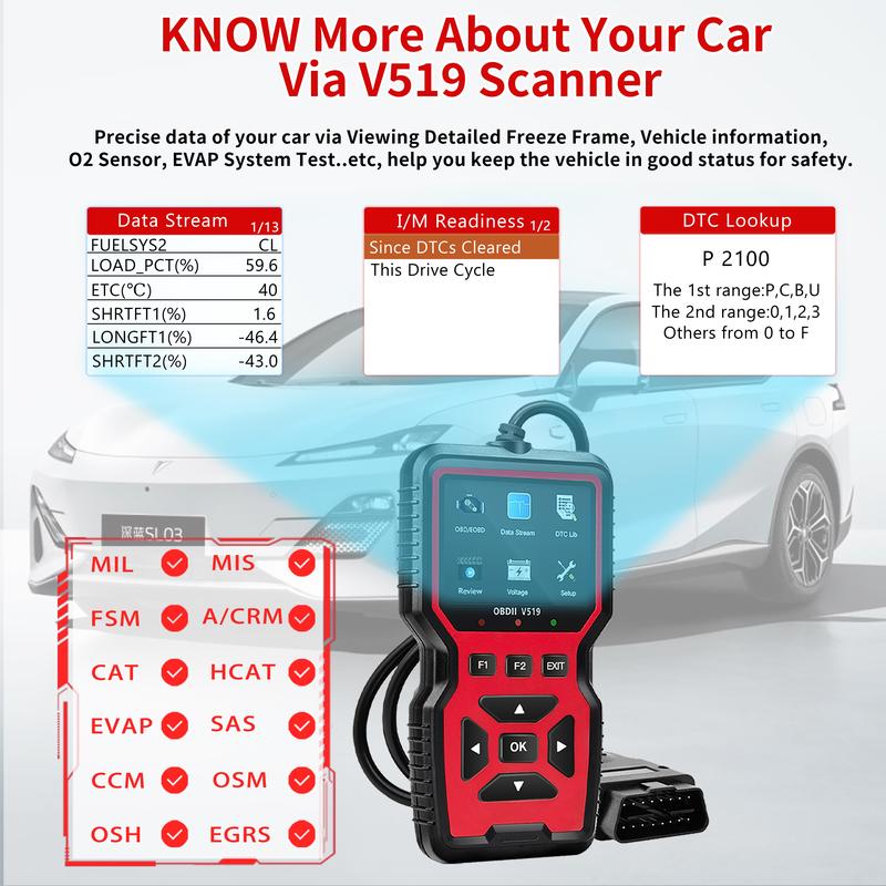 [Comprehensive Functions] Quickly read the current fault of the car; clear the engine fault light; quickly read the car engine real-time data flow information; fault code query; playback function; comprehensive detection: mode 6 detection; oxygen sensor test; mode 8 detection.