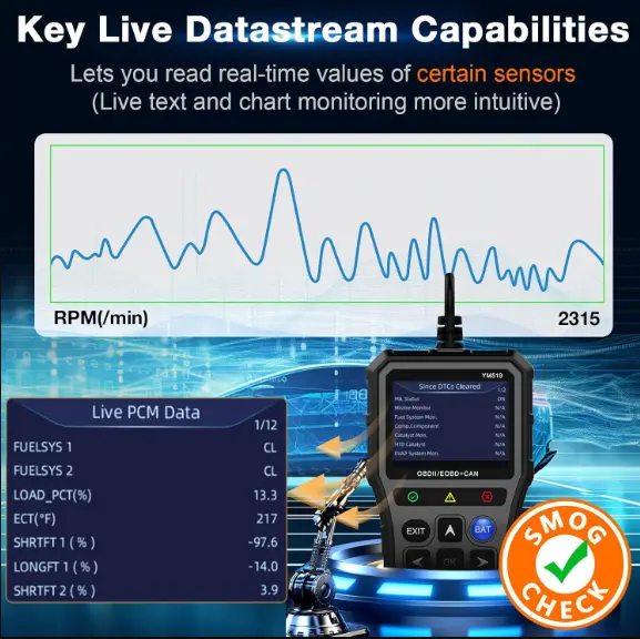 Comprehensive Monitoring: It reads/clears DTCs, displays battery voltage, monitors real-time data, resets the CEL, and more. (Note: Airbag or ABS codes not supported.)