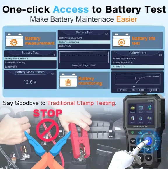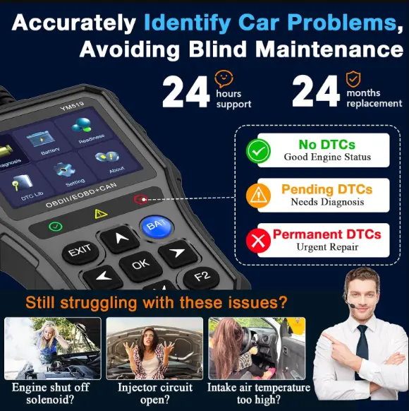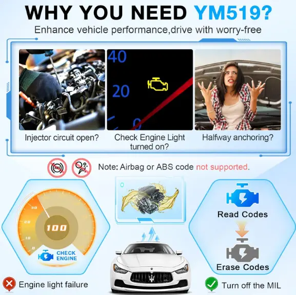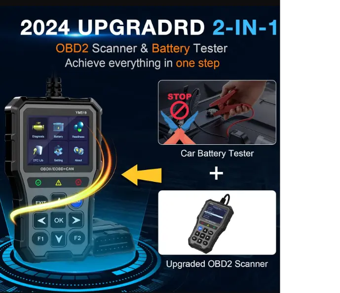 Effortless Vehicle Diagnostics: The YM519 OBD2 scanner offers plug-and-play convenience, instantly retrieving fault codes and real-time performance metrics with no setup required. Its 2.2ft low-resistance cable ensures stable data transfer. Ideal for both beginners and experts, it reads fault codes, checks battery life, and provides a comprehensive car health assessment. (Note: Airbag or ABS codes not supported.)