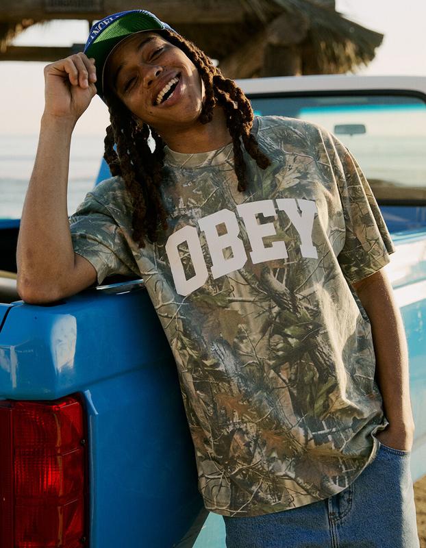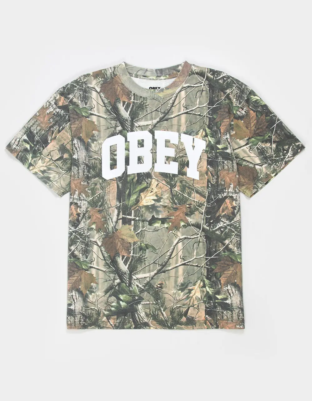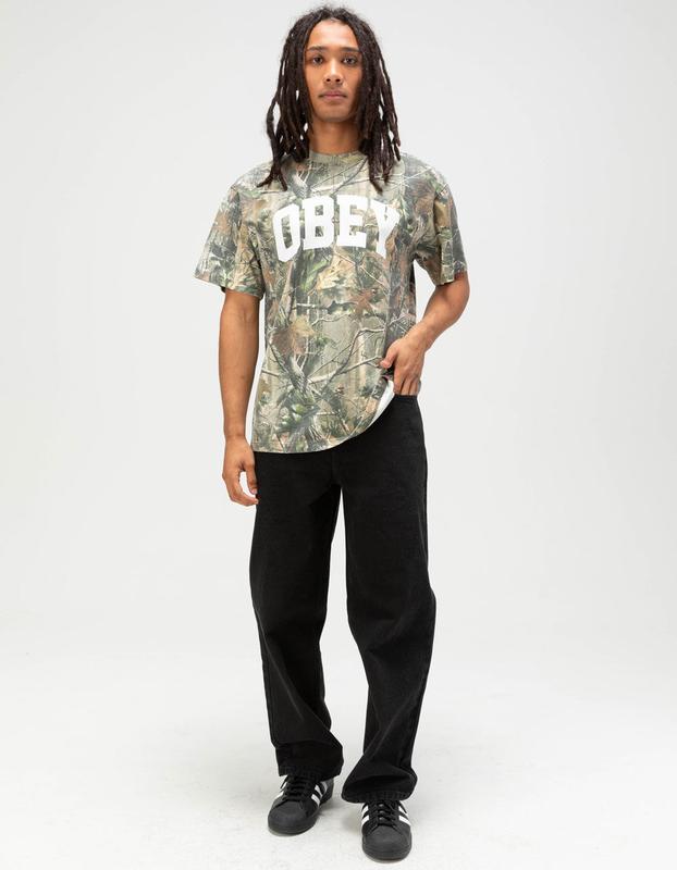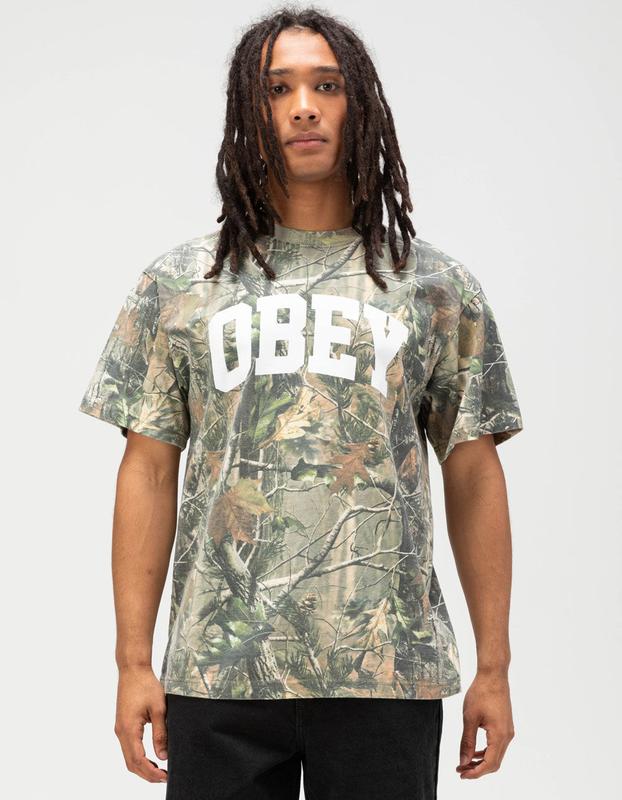 Obey Leaf Camo Tee. Allover camo pattern. Large Obey text screened across the chest. Crew neck. Short sleeve. 100% Cotton. Machine wash. Imported.