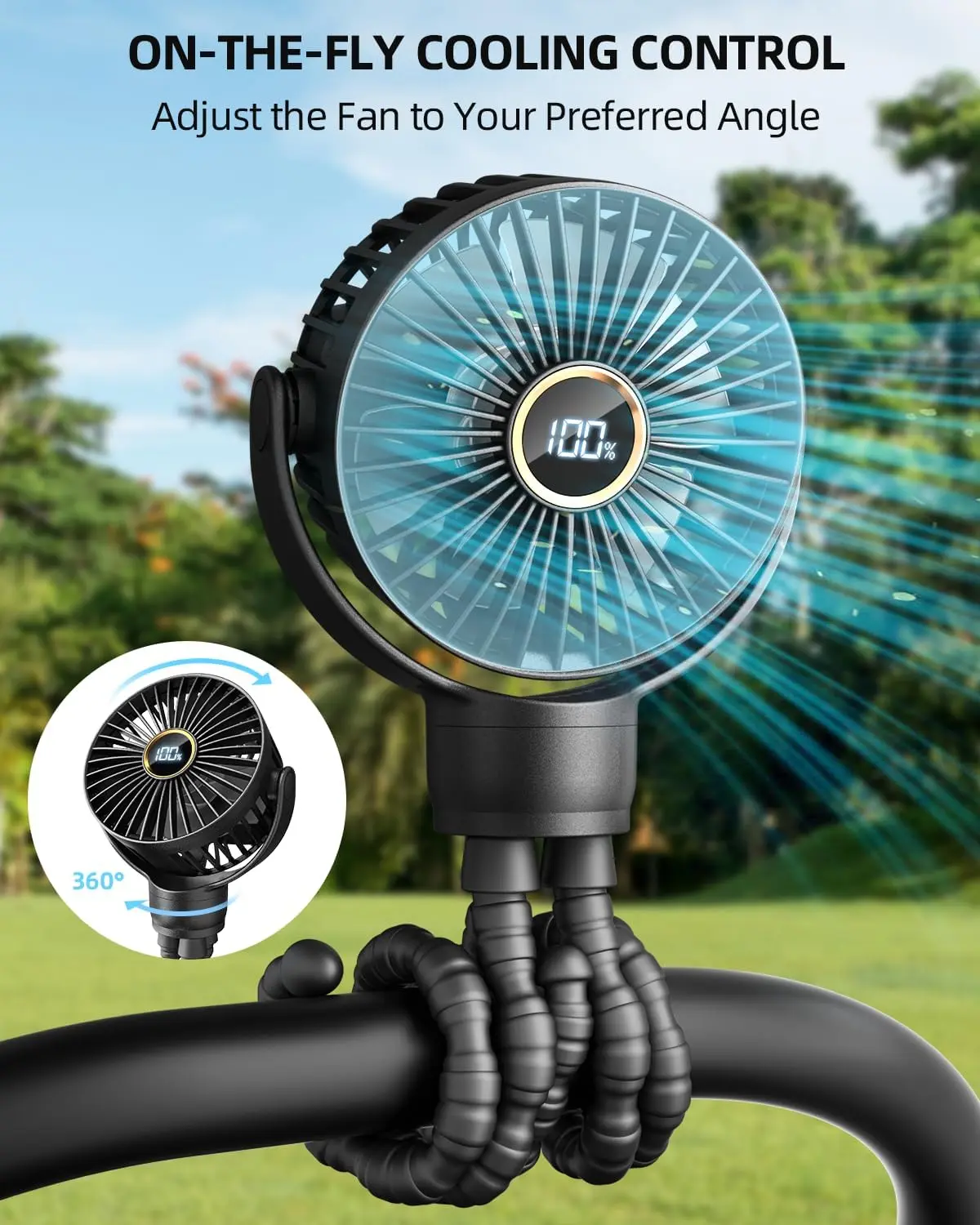 overall an amazing item! lots of convenient features such as the LED display to show battery percentage, the tentacles my only issue is the charging time. outside of that, functionality is top tier! been recommending it to friends. keeps me very cool with minimal noise!