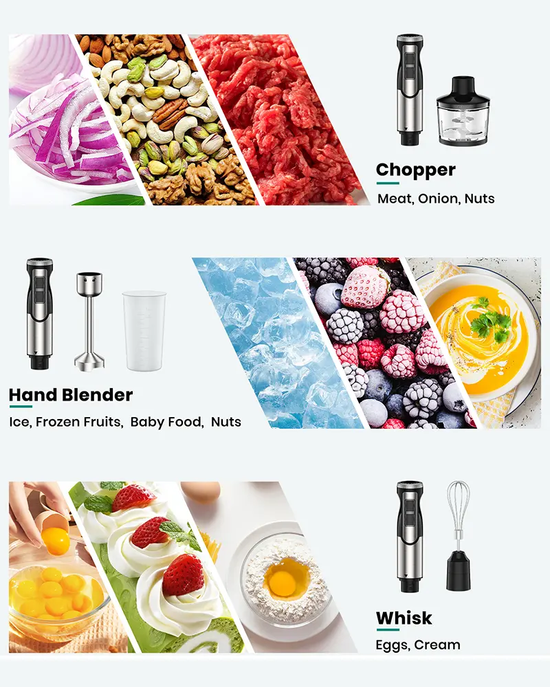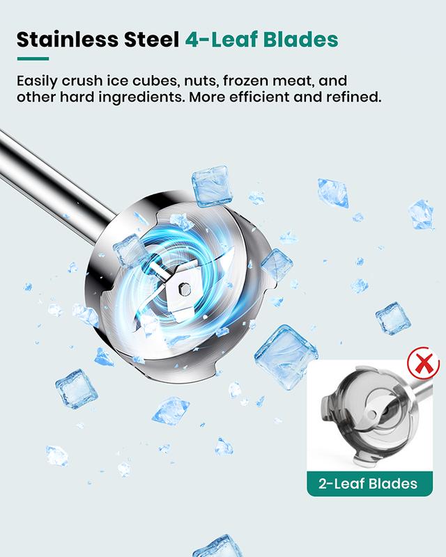 ·【Stainless Steel 4-Leaf Blades】Our hand held blender and chopper blades are made of 4-leaf stainless steel. Hand blend adopted 4-blade semi-wrapped blades to prevent food splashing. Chopper with two-level “S” blade. Not only improves the mixing efficiency but also makes the food more delicate.