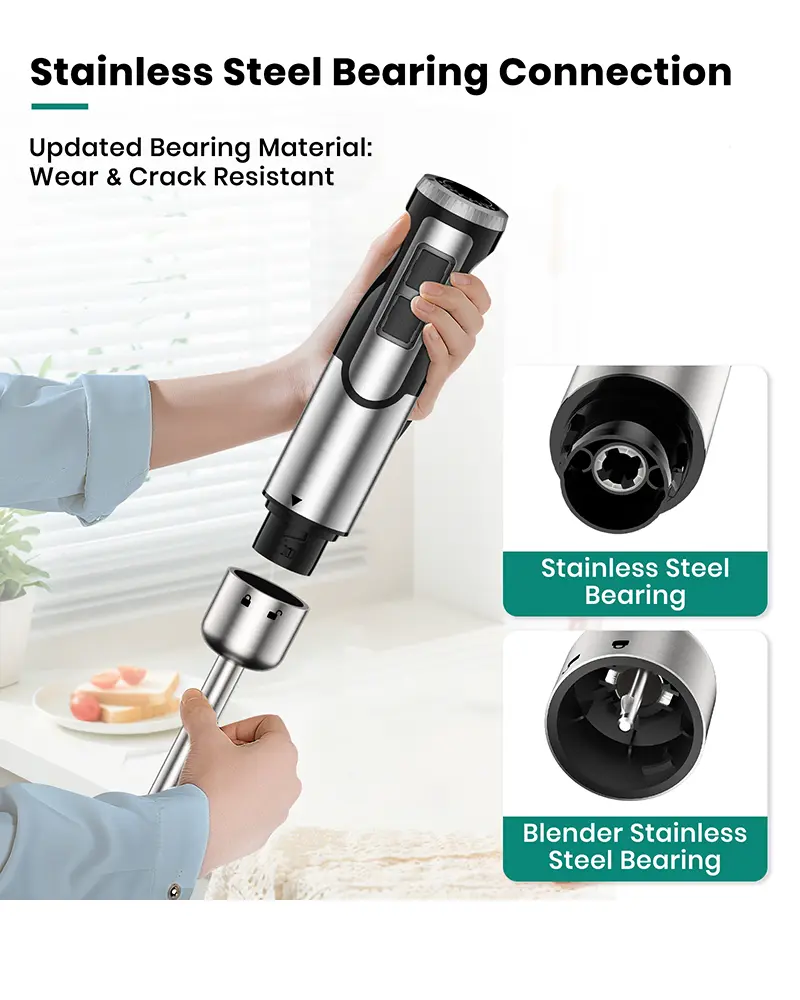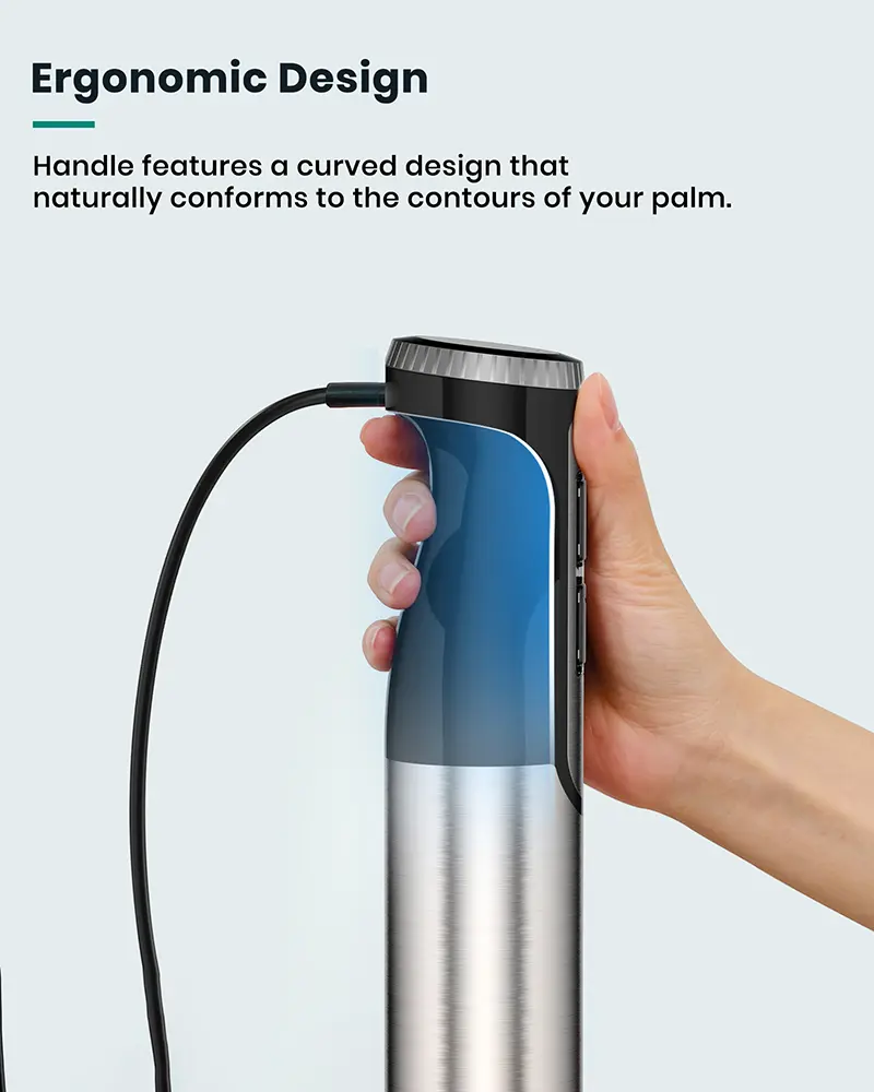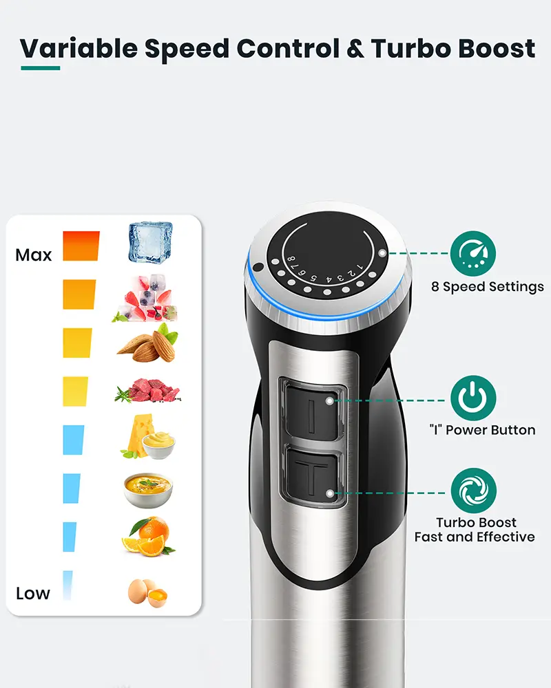 【Multiple SpeedSpeed Control】8 variable speeds and turbo boost, can finely control the ingredients to meet the needs of different ingredients. Immersion blender handheld bar has an ergonomic design, which is more comfortable to hold and relieves the pressure of your hands