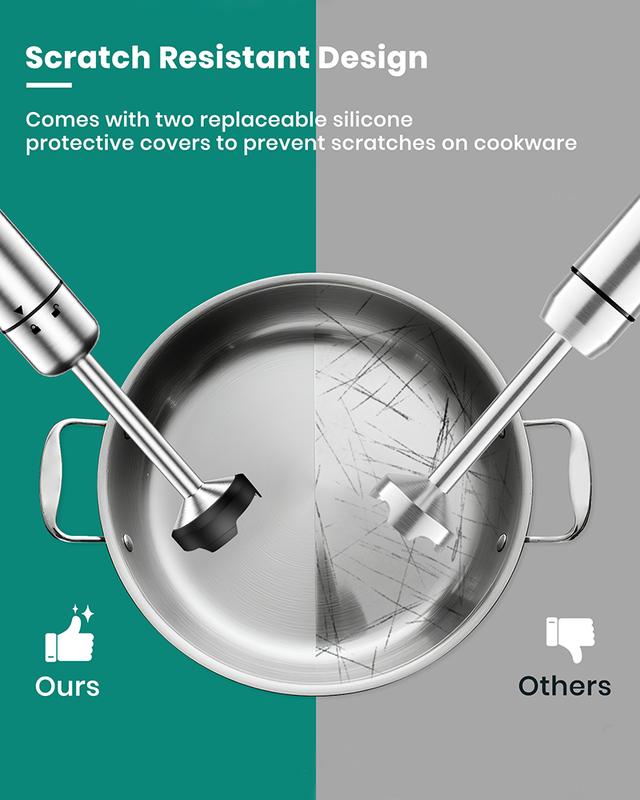 ·【Scratch Resistant and Easy to Clean】Comes with 2 silicone scratch resistant protectors to avoid your pots and pans from scratching. All detachable accessories can be cleaned with water (Note: the motor body can only be wiped with a damp cloth)
