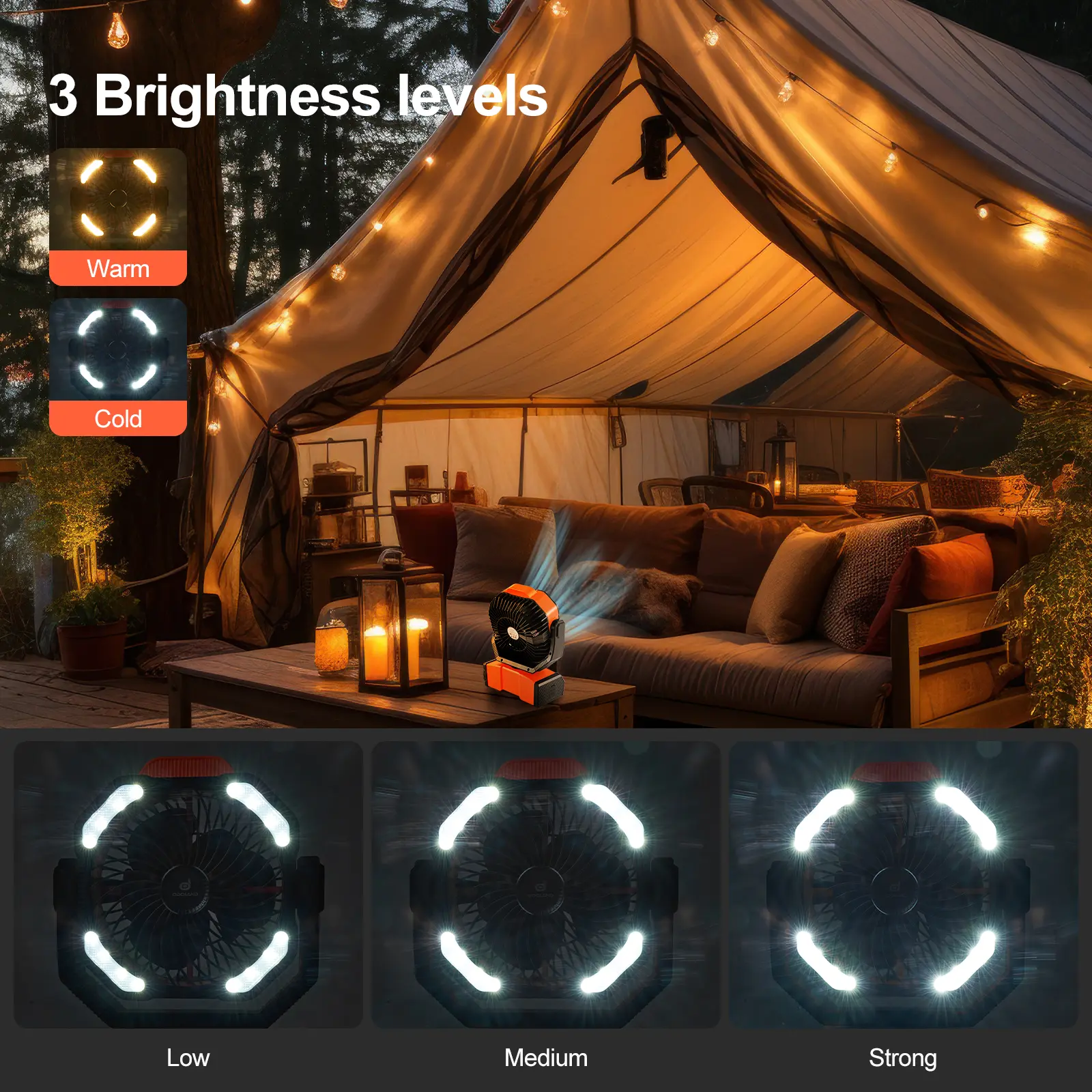 ·Portable Tent Fan Lantern: Lightweight and compact design. Ideal for camping, traveling, hurricane season, and power outages. Standing and hook design for versatile use.