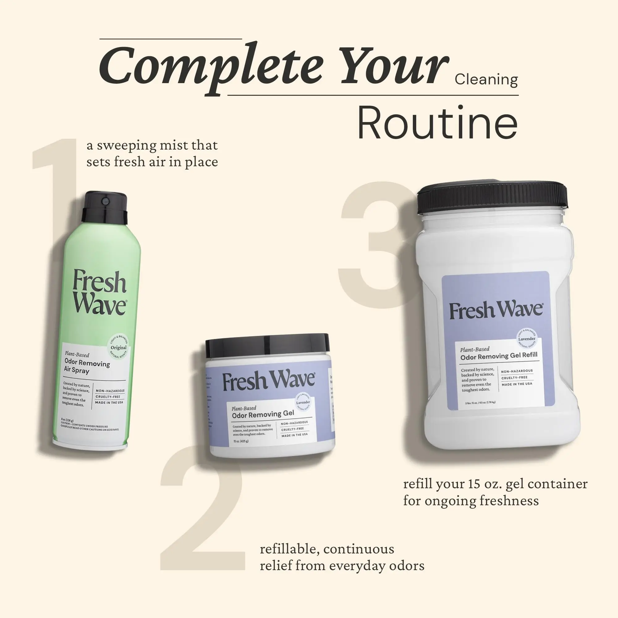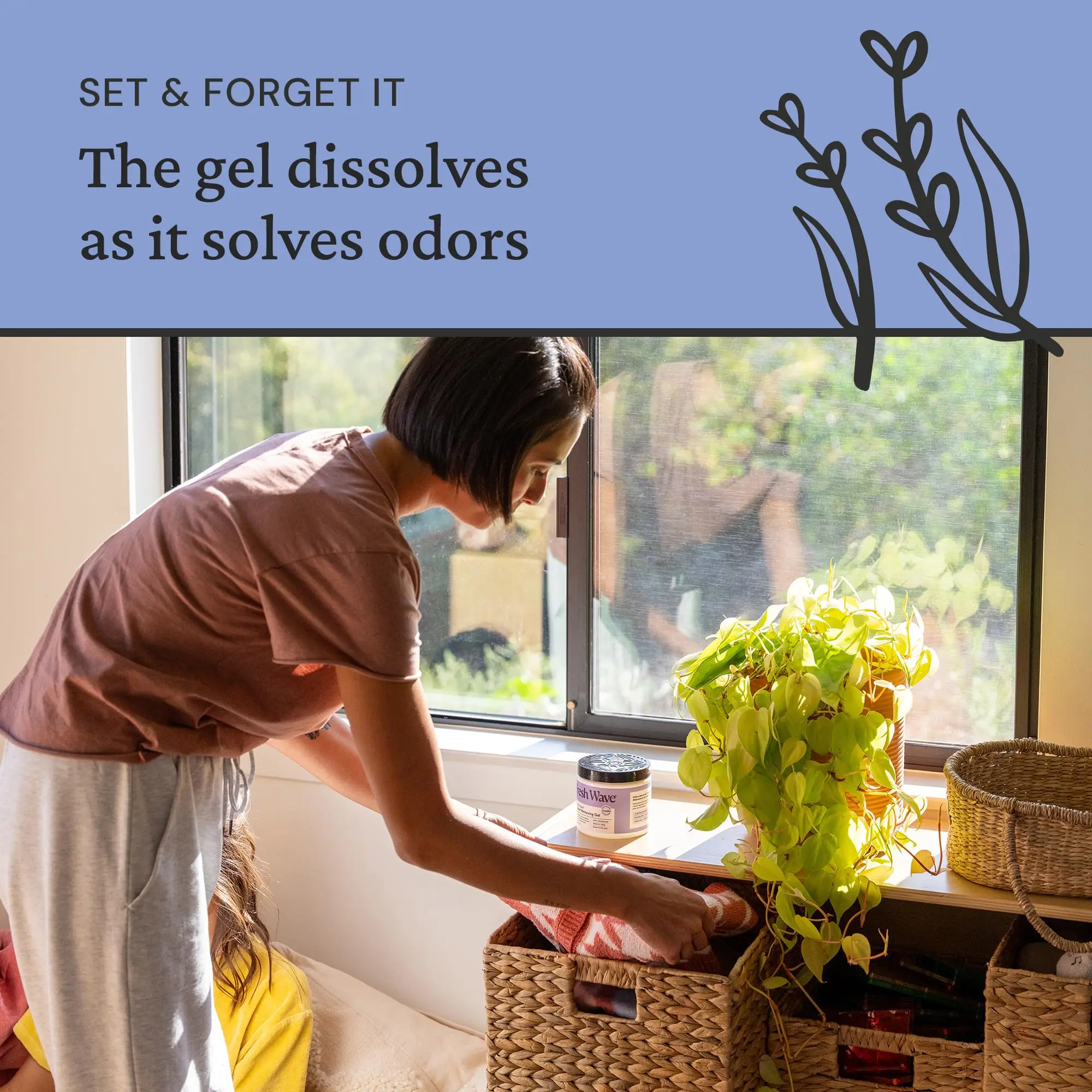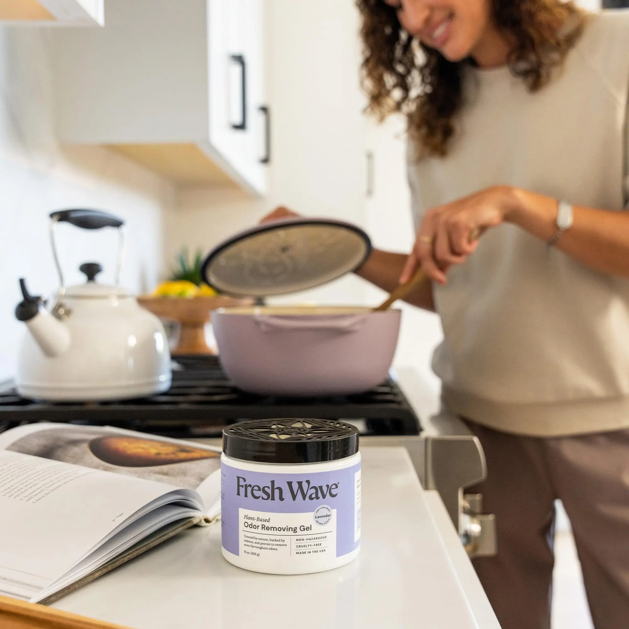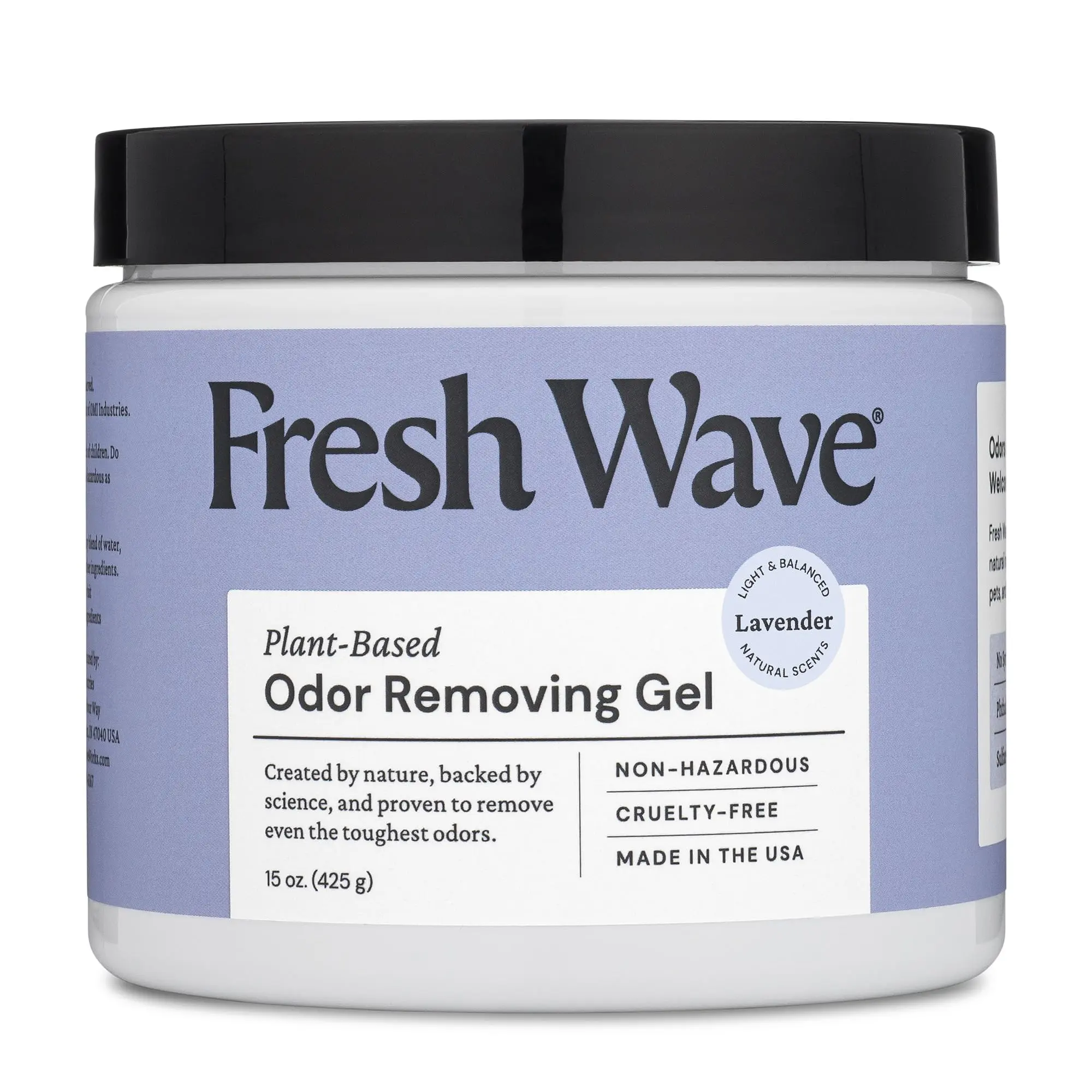 You asked, we listened. By popular demand, our classic odor-eliminating gel is now infused with lavender oil. Like all Fresh Wave products, this gel is powered by plant oils and sound science to remove odors in your home for good. Simply remove the cap, peel the foil lid, return the cap, and set the gel wherever you need continuous relief from odors—bathrooms, basements, closets, kids’ rooms, you name it. LAVENDER-INFUSED You asked, we listened. The people demanded lavender, so we added lavender to our proven blend of plant oils. Each natural, active ingredient is here with a job to do—remove odors from your air. Now it’s even fresher with a hint of lavender essence. PLANT-BASED AND POWERFUL Inside your gel you’ll find lavender, lime, pine needle, clove, anise, and cedarwood. When you first peel the foil lid, you’ll experience this woodsy and citrusy scent, but the smell disappears as the gel starts working. 30+ YEARS OF SCIENCE We got our start tackling some of the toughest industrial odors: think landfills