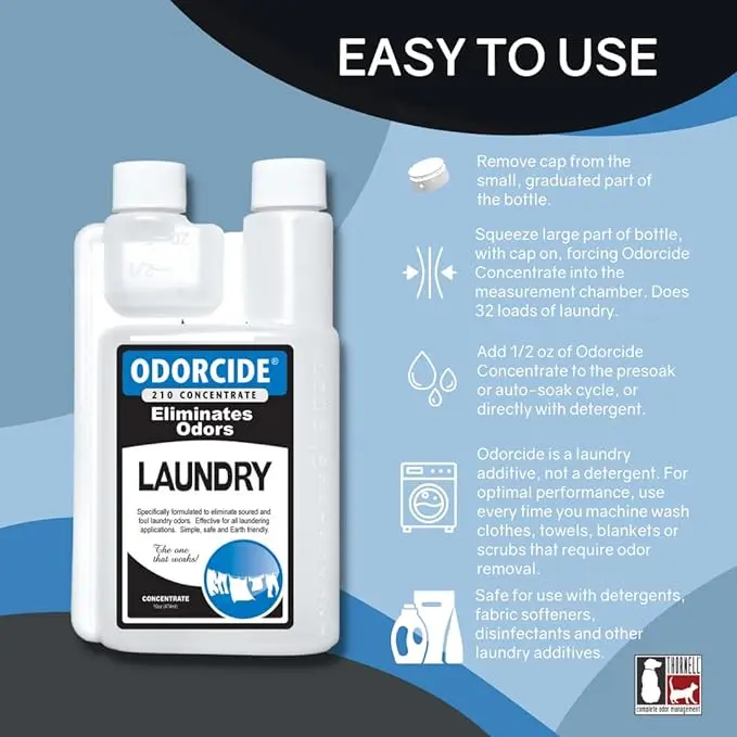 Save Time & Money: No more washing clothes more than once to get rid of foul odors! Simply add Odorcide odor absorber for strong odor to the pre-soak or soak cycles or directly with the detergent to keep your clothes (and washing machine) smelling fresh! Extremely economical, you only need 1/4 ounce to 1 ounce of Odorcide concentrate per load of laundry.