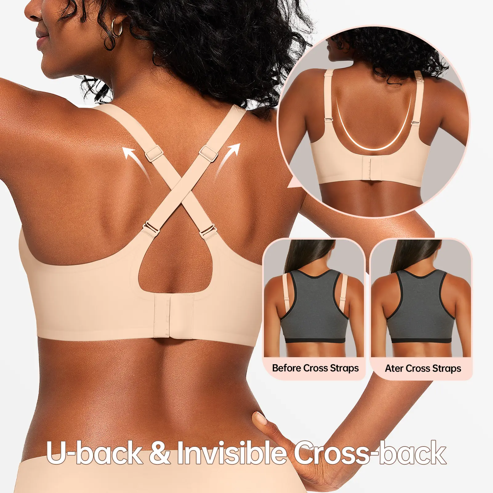 Ā·ćU-back & Invisible Cross-back Strapsć The U-back wearing is comfortable and unrestricted, ideal for everyday wear like traveling, working, and lounging at home. OEAK seamless bras for women can be used as sleep bras, t-shirt bras, yoga bra, light sport bras and casual everyday wear. The Cross-back style enhances support and lift, suitable for running, working out, and cycling. OEAK seamless bra will go well with any outfit, such as a t-shirts, blouses, tank tops, dresses, etc.