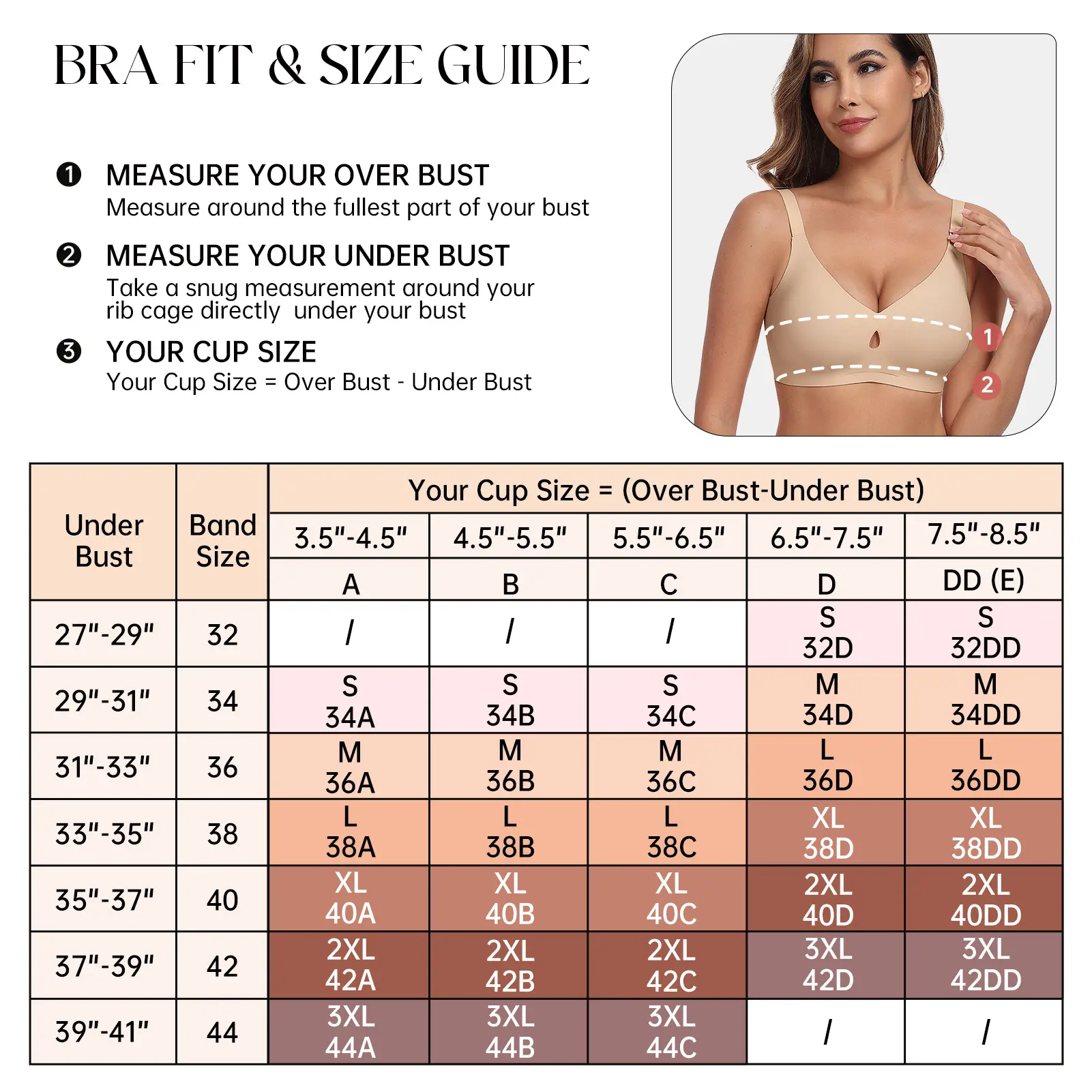 Ā·ćButtery Smooth FabricćOEAK bralettes for women are crafted from a silky smooth blend of 55% Nylon and 45% Spandex, offering a lightweight and comfortable feel like Skin. You can wear it all day without worrying about leavingćindentations. The push up bra comes in a variety of sizes, from S to 3XL, S(32D,32DD,34A,34B,34C);M(34D,34DD,36A,36B,36C);L(36D,36DD,38A,38B,38C);XL(38D,38DD,40A,40B,40C);2XL(40D,40DD,42A,42B,42C); 3XL (42D,42DD,44A,44B,44C).