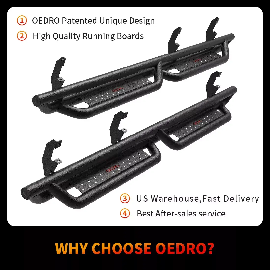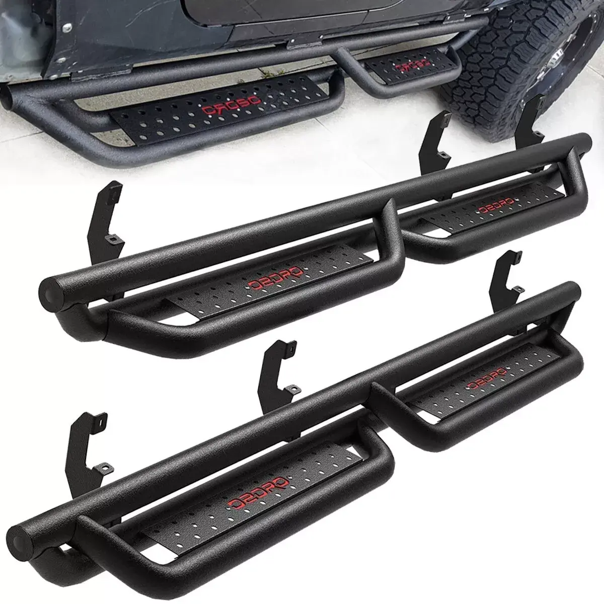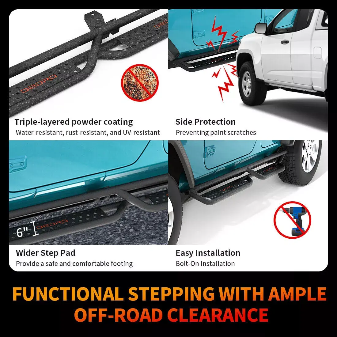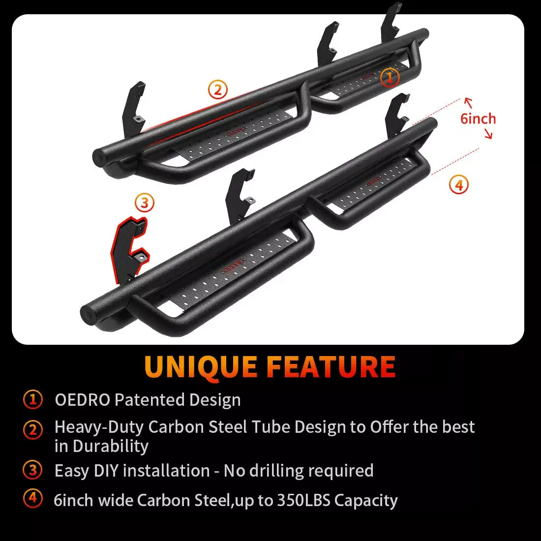 Functional Convenience: ① All steel tube design provides more protection for the bottom and the side of the car, also preventing from getting stuck on the rocker plate or hanging obstacles; ② 6inch leaf shaped drop down step pad for great accessibility for pickup trucks with lift kits and oversized wheel tires keep enough ground clearance