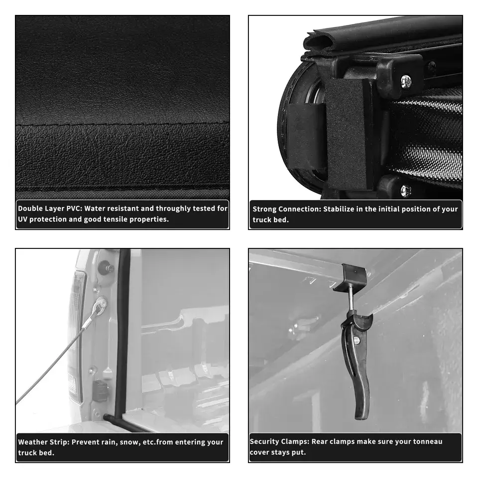 【HEAVY DUTY MATERIAL】 Composed of double layer PVC, YITAMOTOR’s truck tonneau cover has been thoroughly tested for UV protection and superior tensile properties. Pre-assembled powder coated rails and aluminum clamps are included for trouble-free installation and formidable stability.