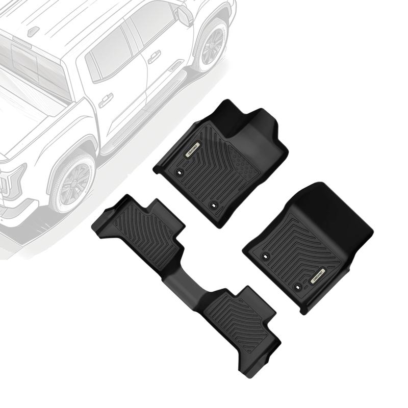 Elevate your Toyota Tundra 2025-2022 Double Cab with these custom fit TPE floor liners. Designed for the 1st & 2nd row, these mats offer a perfect fit. The TPE material ensures durability and protection against all weather conditions. Ideal for maintaining a clean and dry interior.