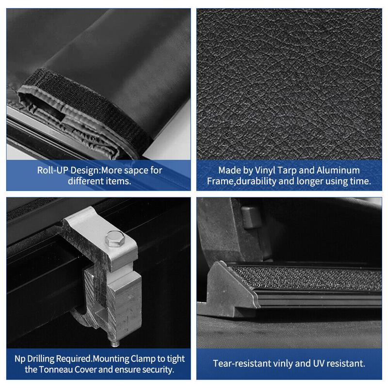 Heavy Duty Material: Being made of double layer PVC, the tonneau cover has been thoroughly tested for UV protection, good tensile properties. Pre-assembled powder coated rails and aluminum clamps are included for easy installation and great stability
