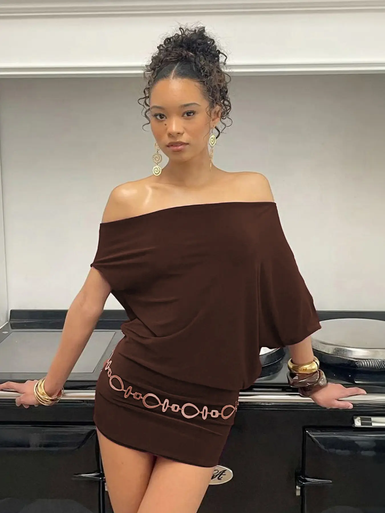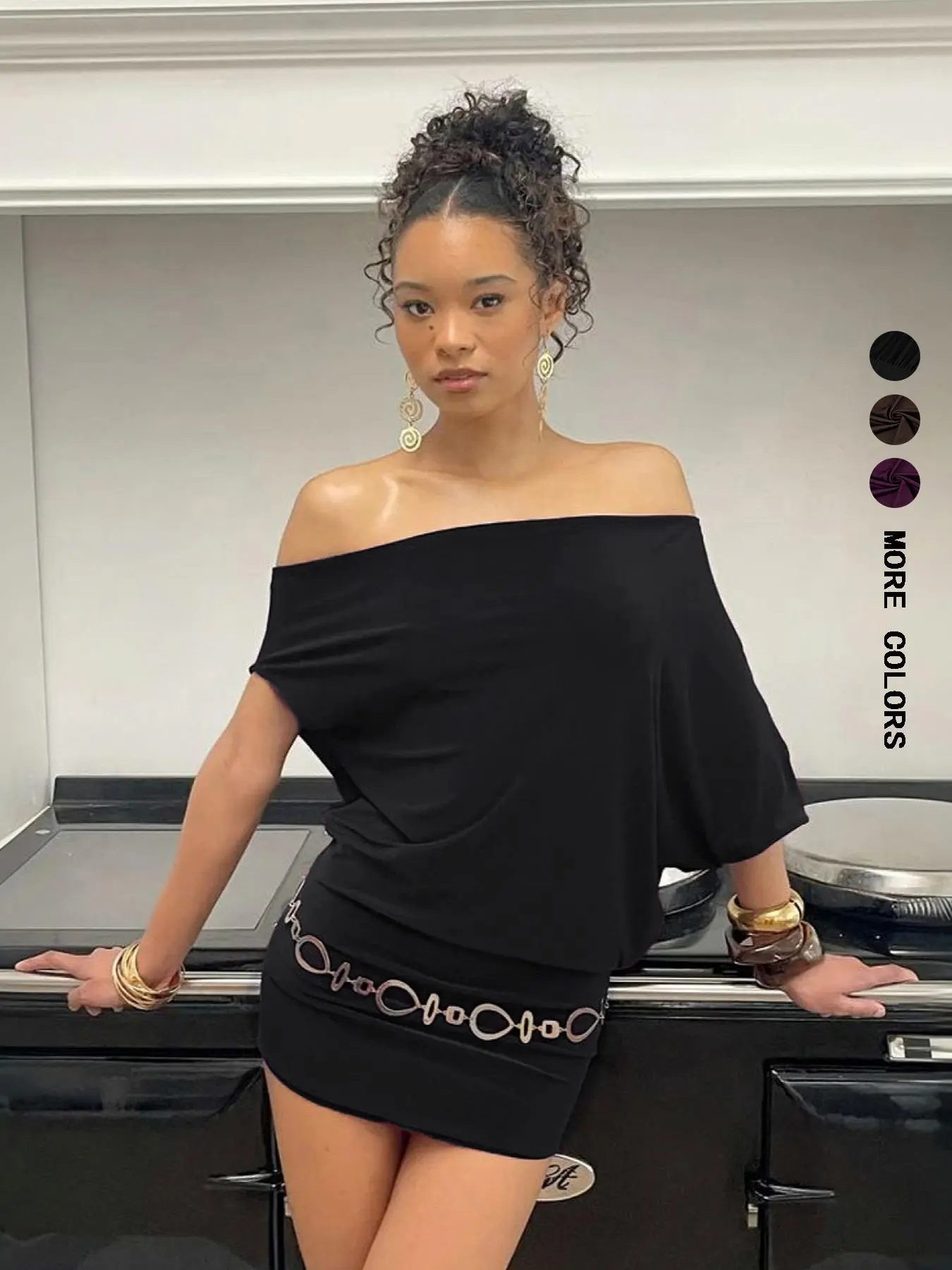 Asymmetrical Batwing Sleeve Off-Shoulder Women's Casual Dress, Trendy Summer Street Style Solid Bodycon Dress for Ladies (without belt)#womenswear #tiktokshopfinds #womensfashion #springfashion #minidress