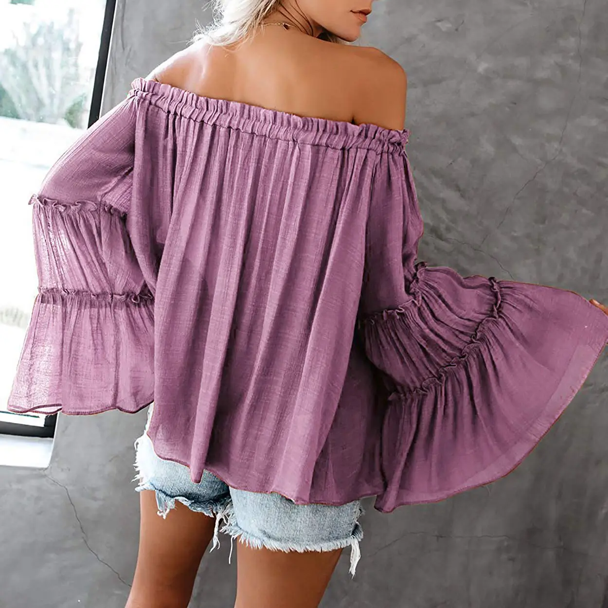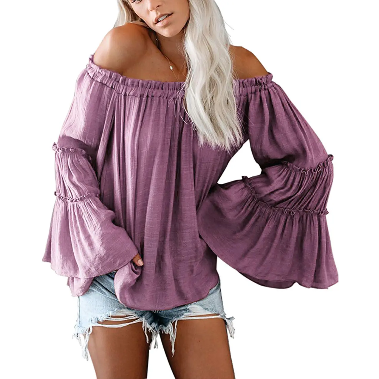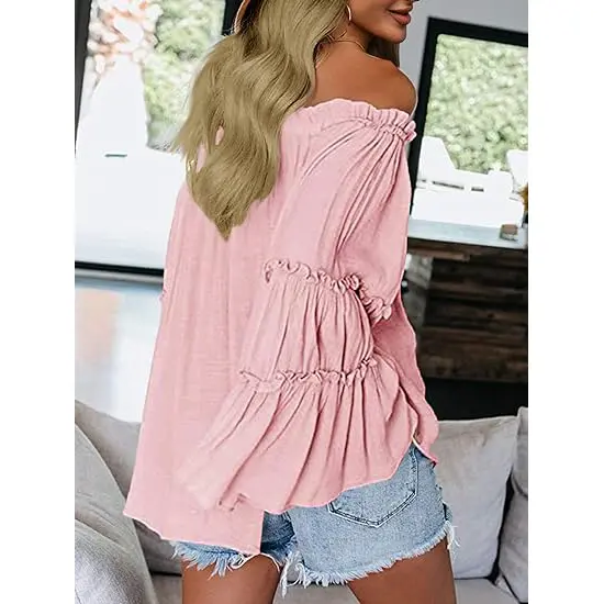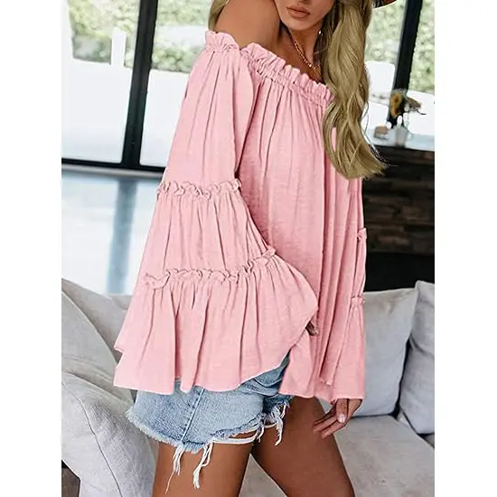 ★Fashion features: Off the shoulder, long bell Sleeve and ruffles design make you more fashionable and elegant,elastic pleated band on shoulder, easy to dress on.
